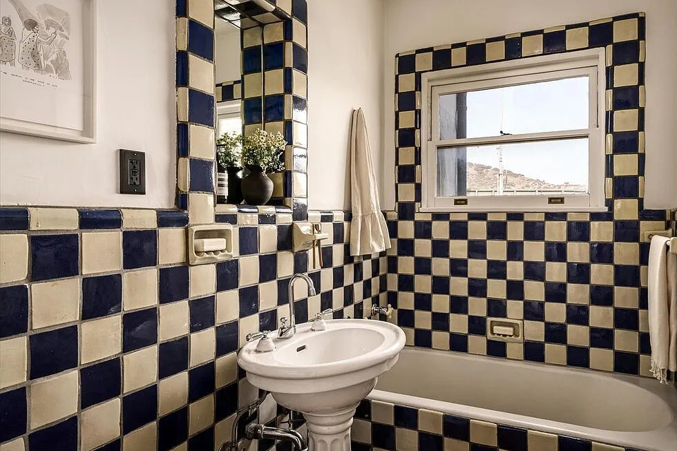 This bathroom surprises you in the best way. The bold checkerboard tile gives the room a fun and striking look. The deep blue squares glow against the soft cream ones. They feel both vintage and fresh.