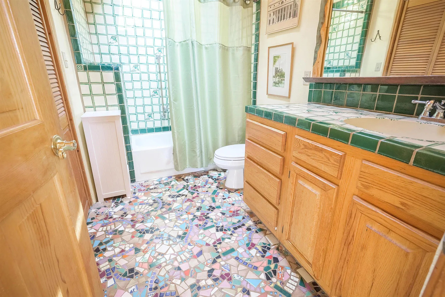 This bathroom grabs your attention the second you step in. The bold green tiles pull your eyes right to the vanity and shower. They feel fresh and earthy, which makes the whole space feel cheerful. But then you look down. The mosaic floor steals the show. It bursts with color and movement, almost like a handcrafted Spanish mosaic found in an old courtyard.
