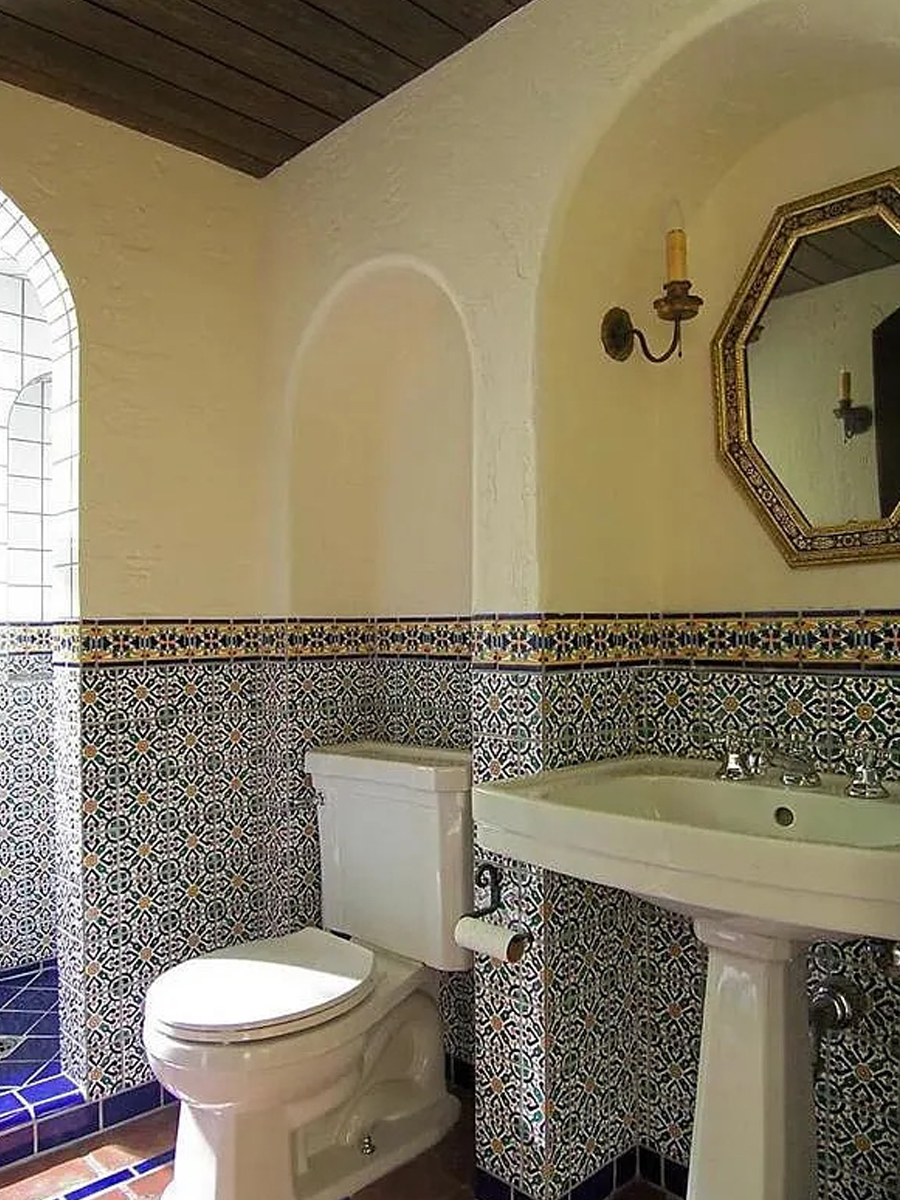 This bathroom catches your eye with its vivid patterned tiles. The colors feel bold but rich, just like classic Spanish homes. The pedestal sink adds an airy touch. The carved mirror adds a splash of drama with its glittering silver frame.