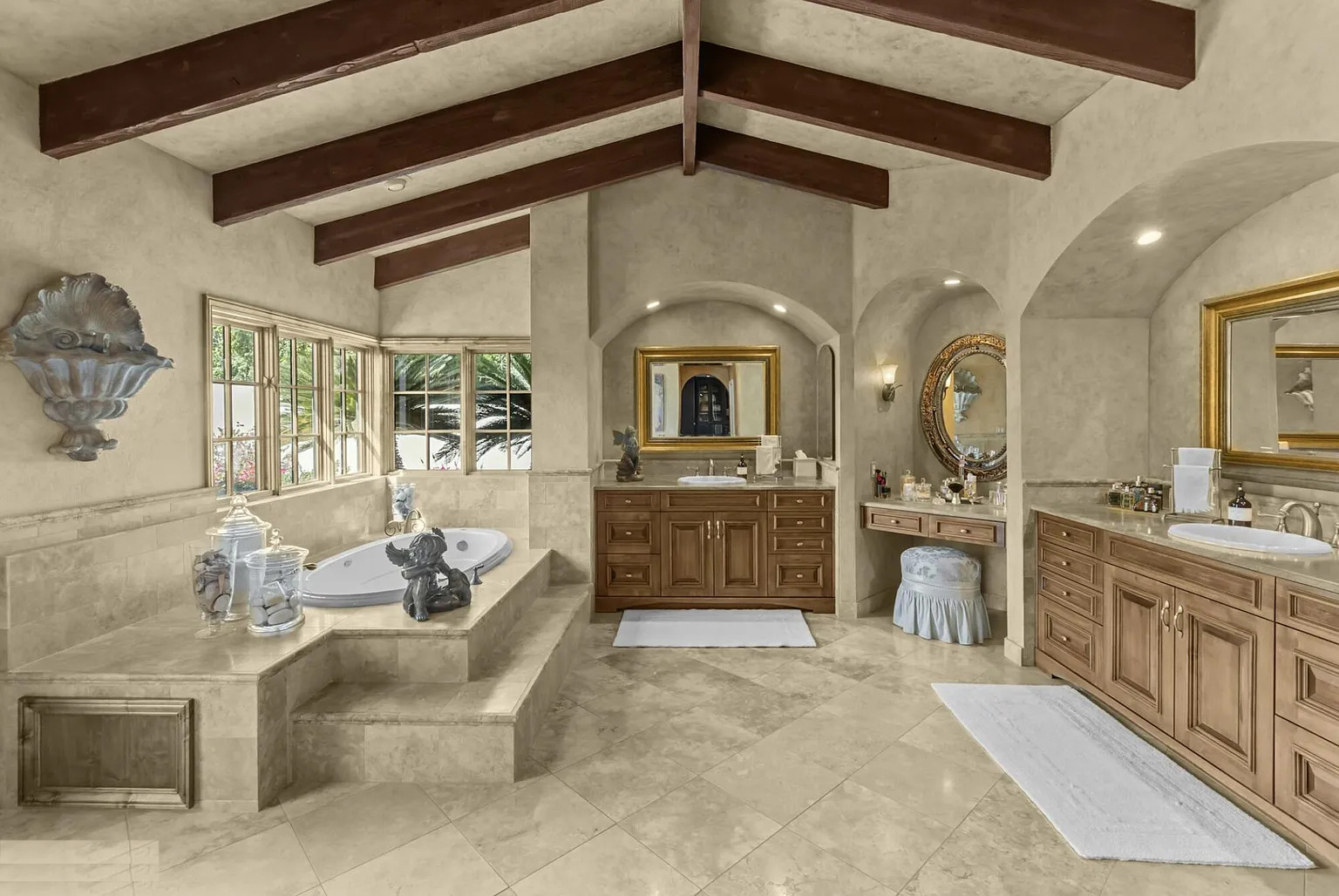 The tub sits on a raised platform, which makes it feel special. It almost looks like a little stage. The view through the windows brings in sunlight and a peek of greenery, so the space stays bright. The vanities look rich with their carved wood doors and classic hardware. Each arched niche gives the room a soft curve, which is a signature detail in Spanish design.