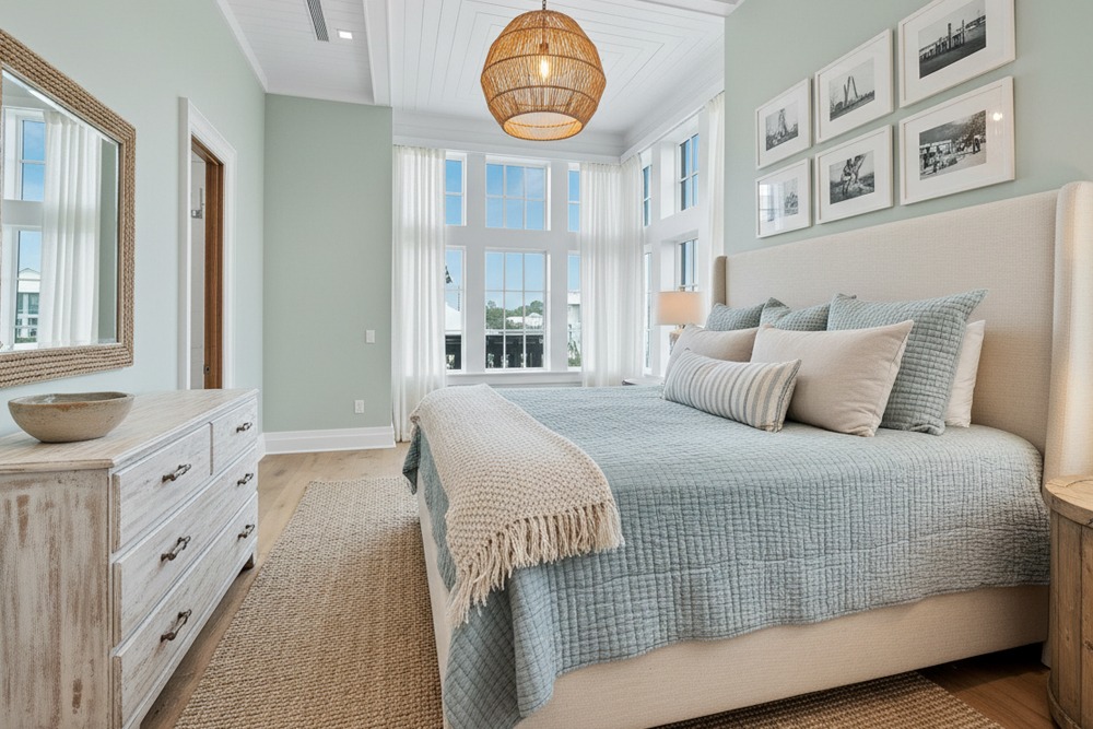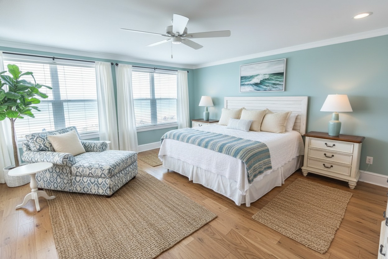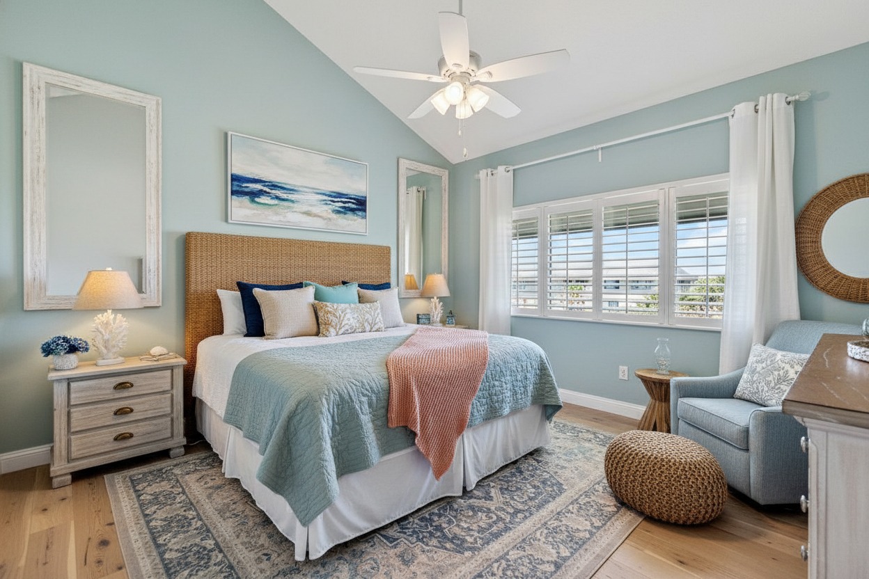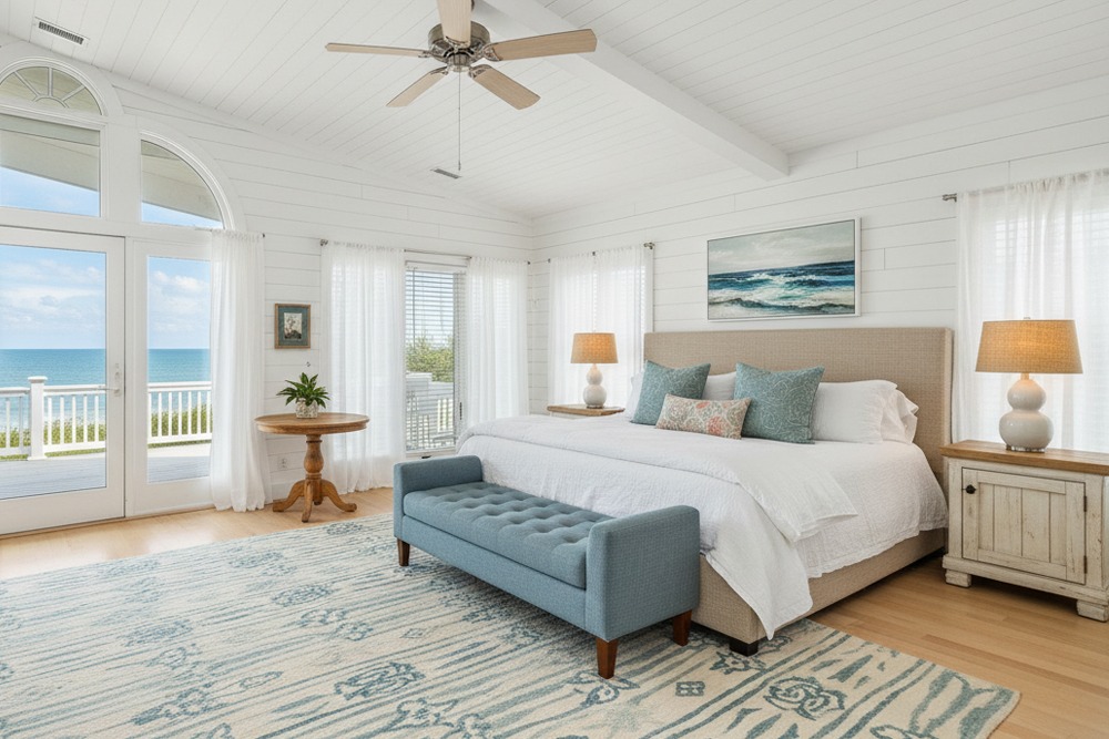 Classic coastal bedrooms lean on light, airy shades. Think white, soft sand, warm cream, and pale gray. Then add ocean-inspired pops like sea-glass green, misty blue, or deep navy.