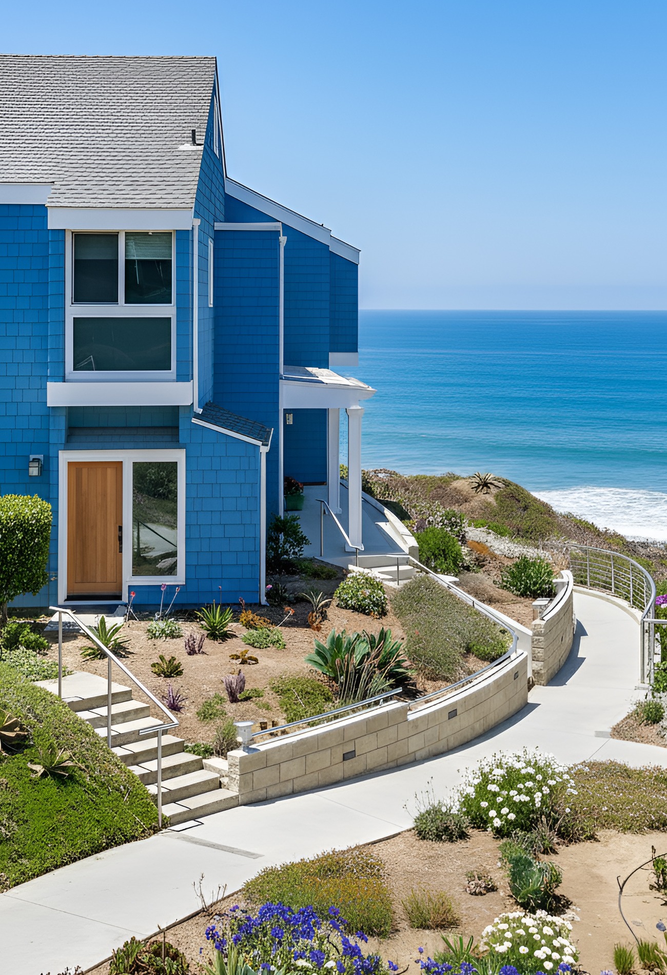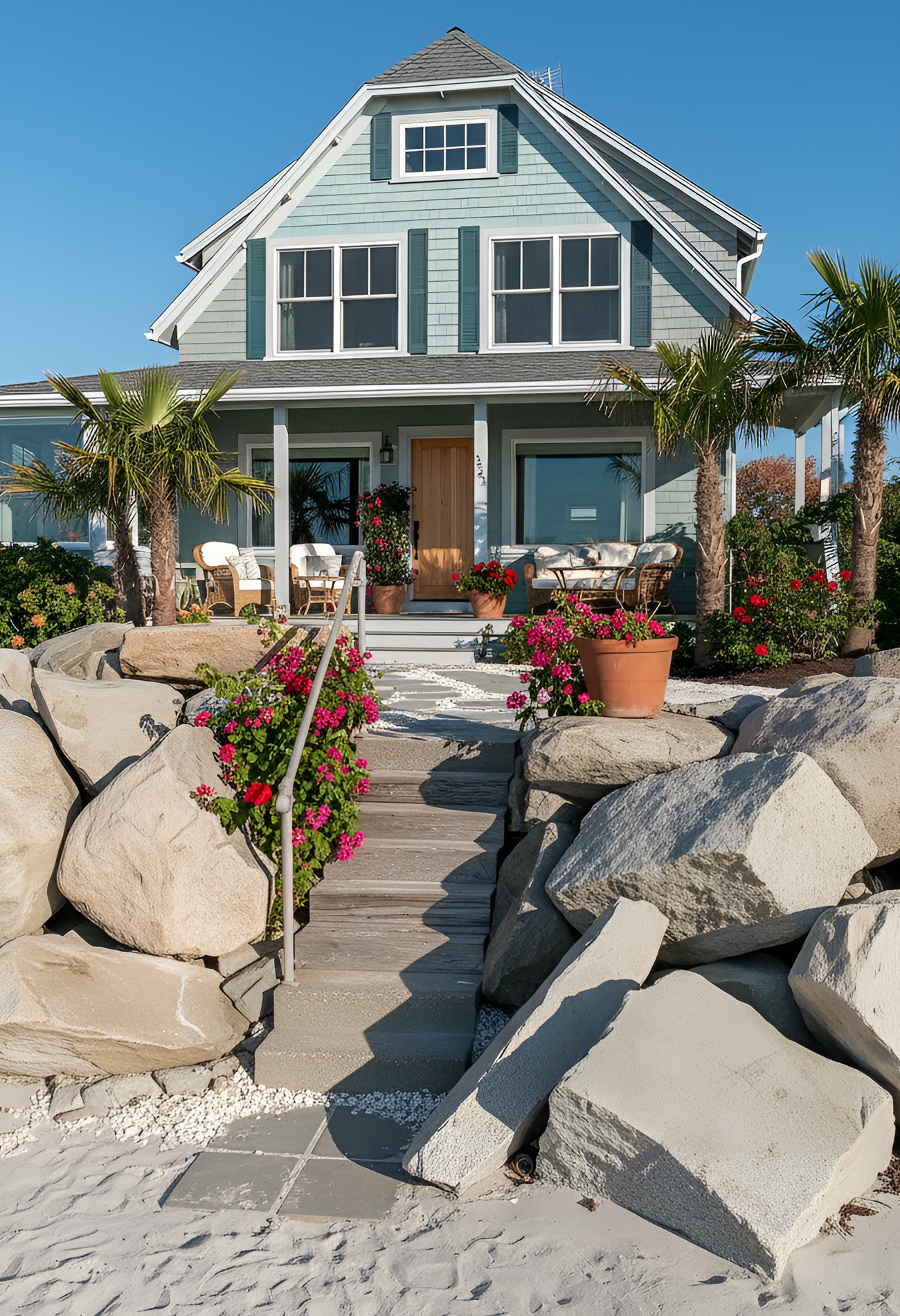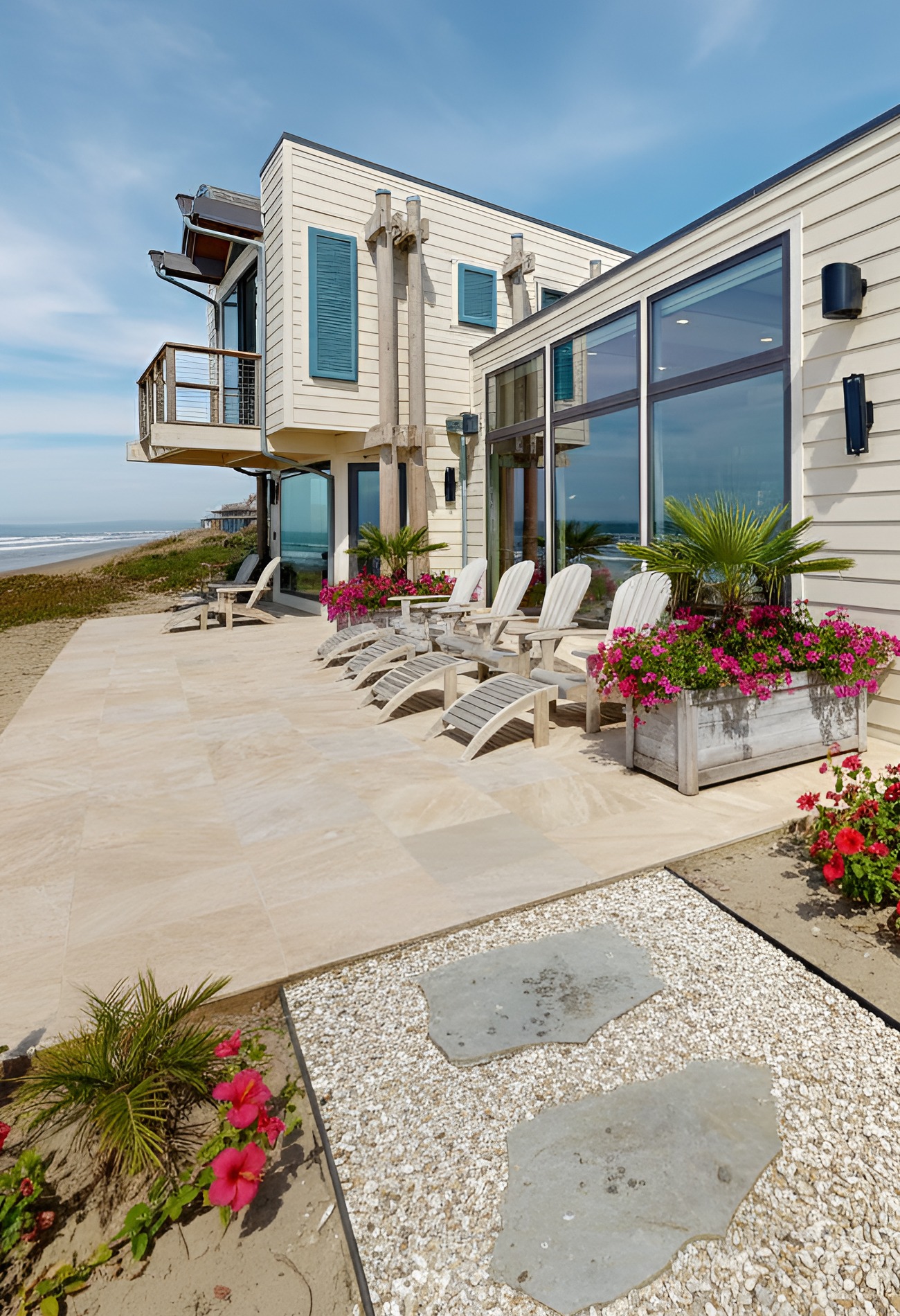 It works well with white trim, black windows, and cedar details. It also looks great with stone steps and gravel paths. Because it has a natural feel, it blends well with dunes, palms, and native grasses.