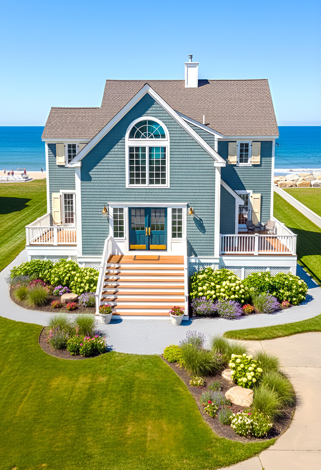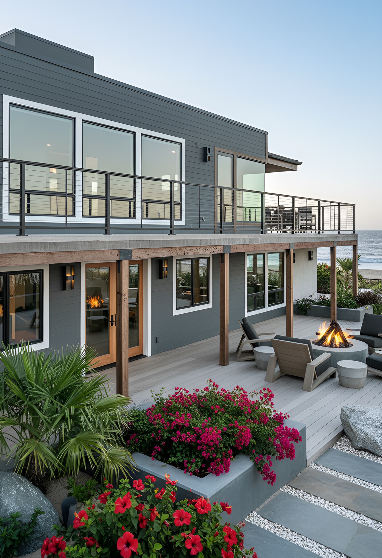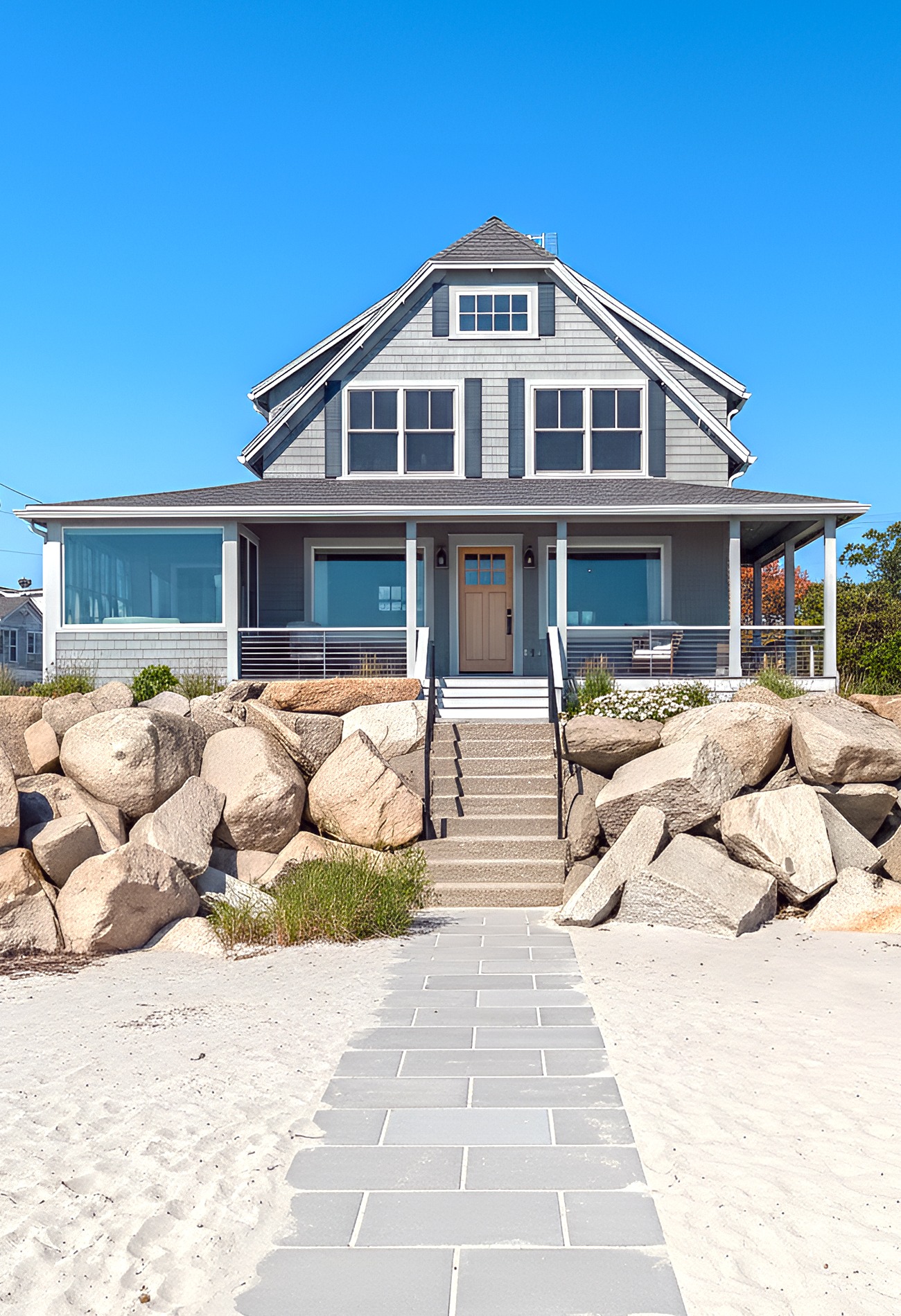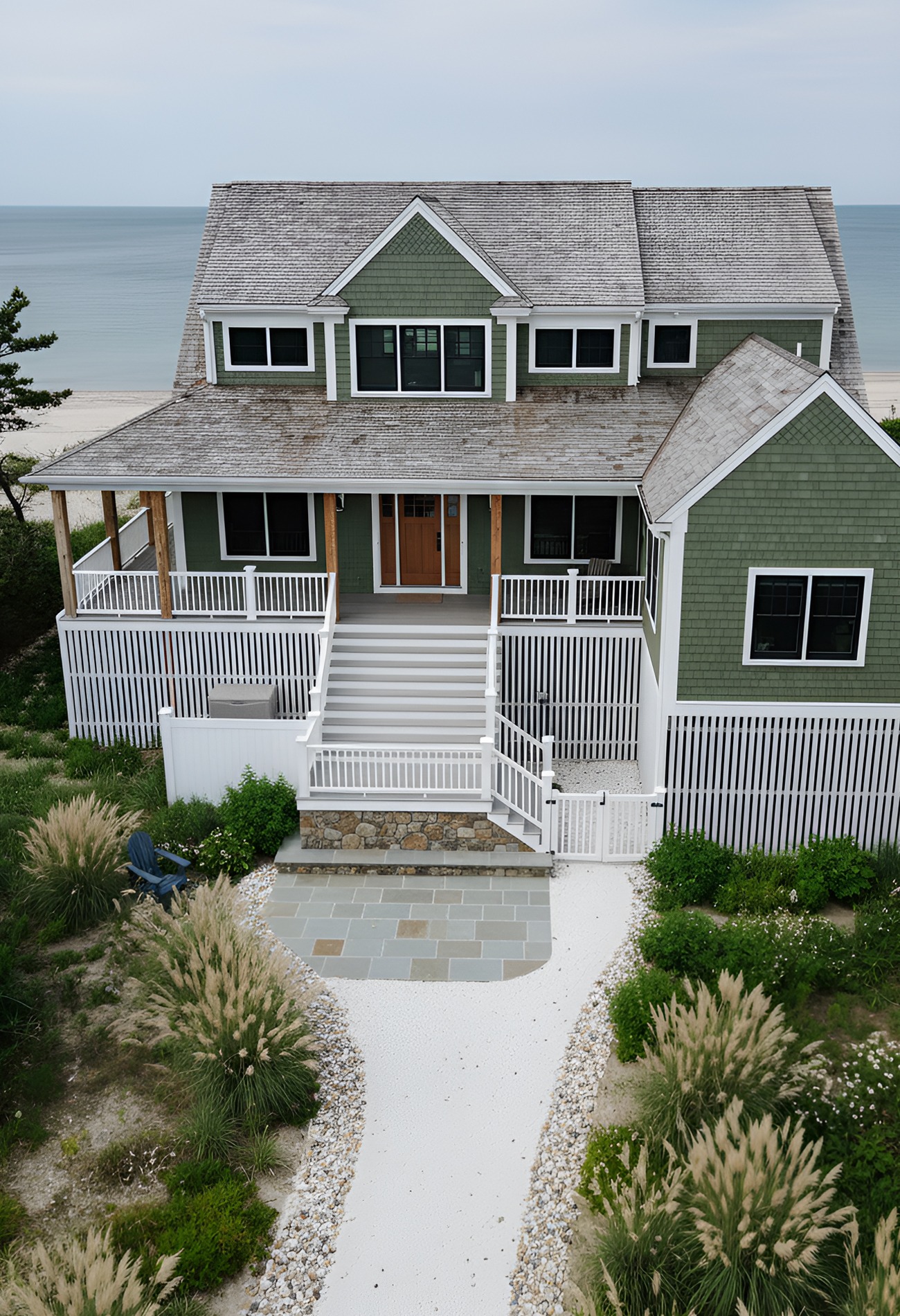 This color works well on almost any beach home style. It can look simple and cottage-like. It can also feel sleek and modern. The key is to layer it with texture. Think board and batten siding, cedar shakes, stone steps, or natural wood beams.