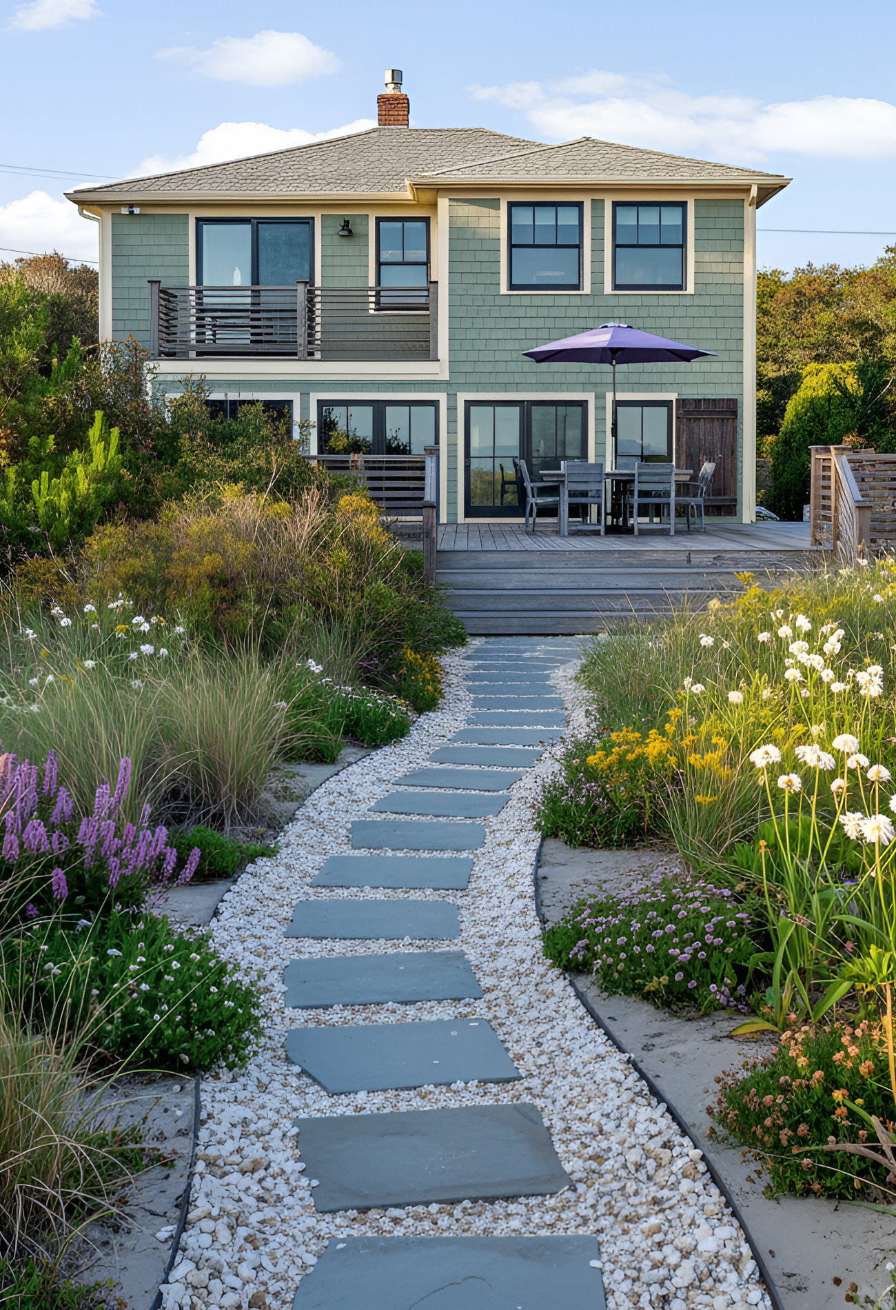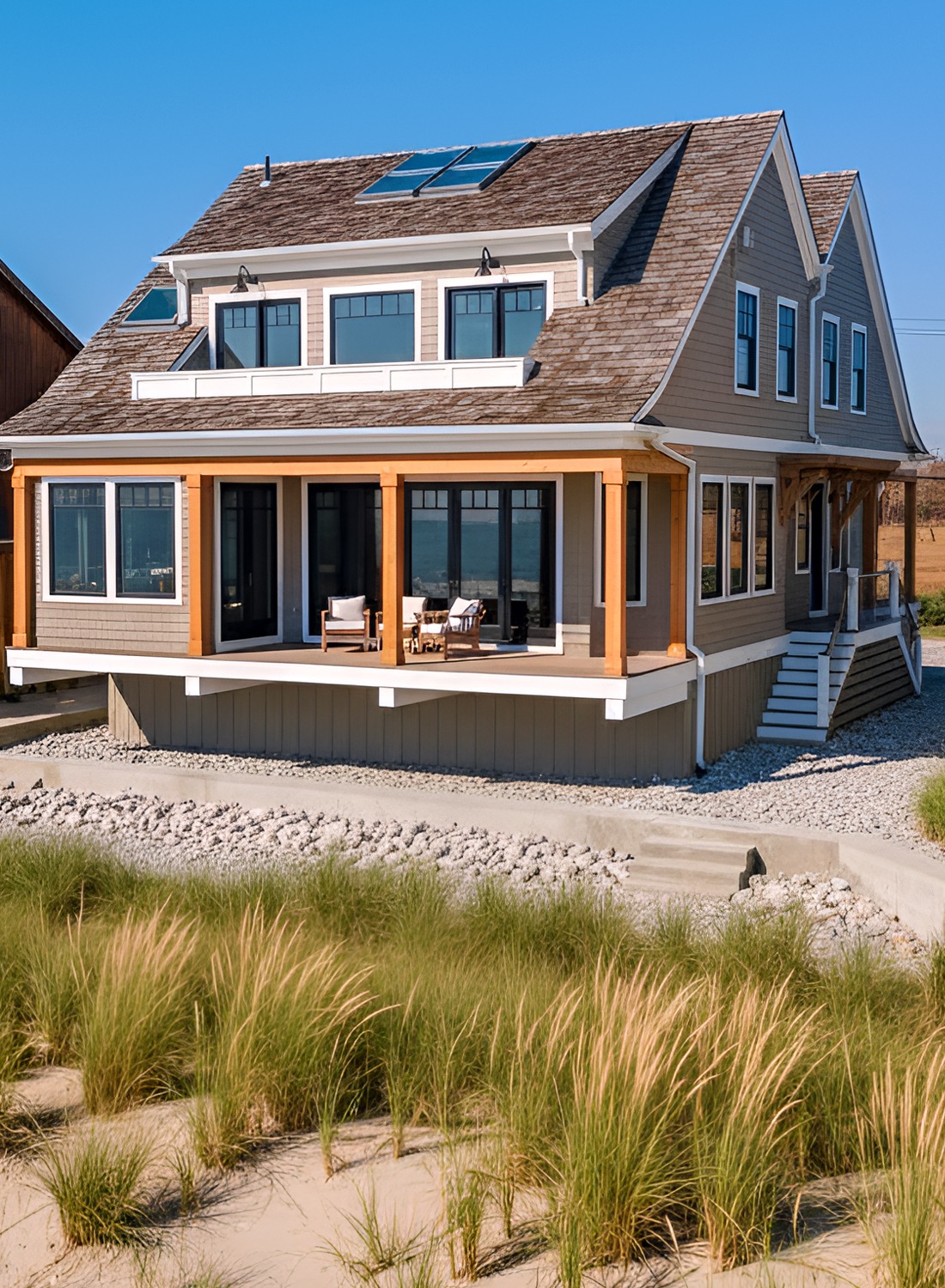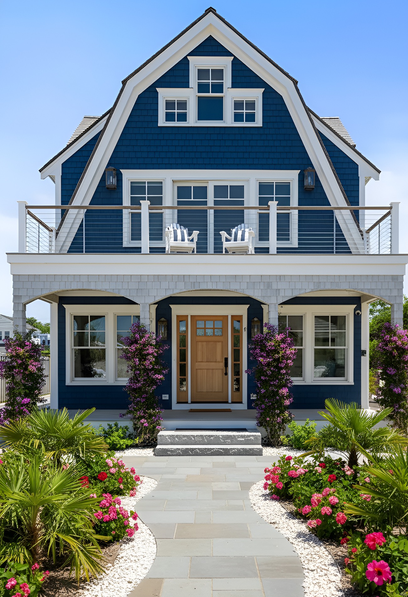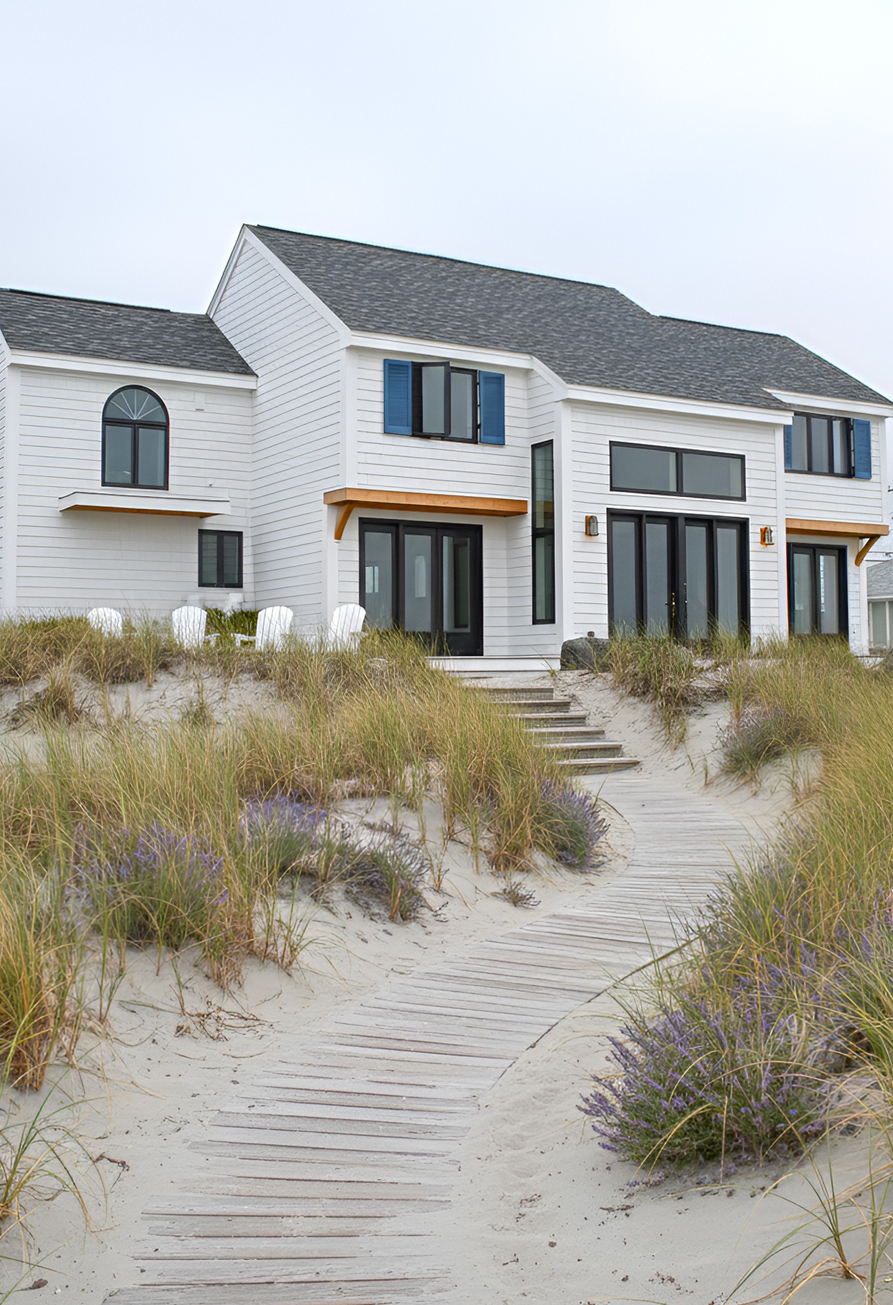 This color works well on almost any beach home style. It can look simple and cottage-like. It can also feel sleek and modern. The key is to layer it with texture. Think board and batten siding, cedar shakes, stone steps, or natural wood beams.