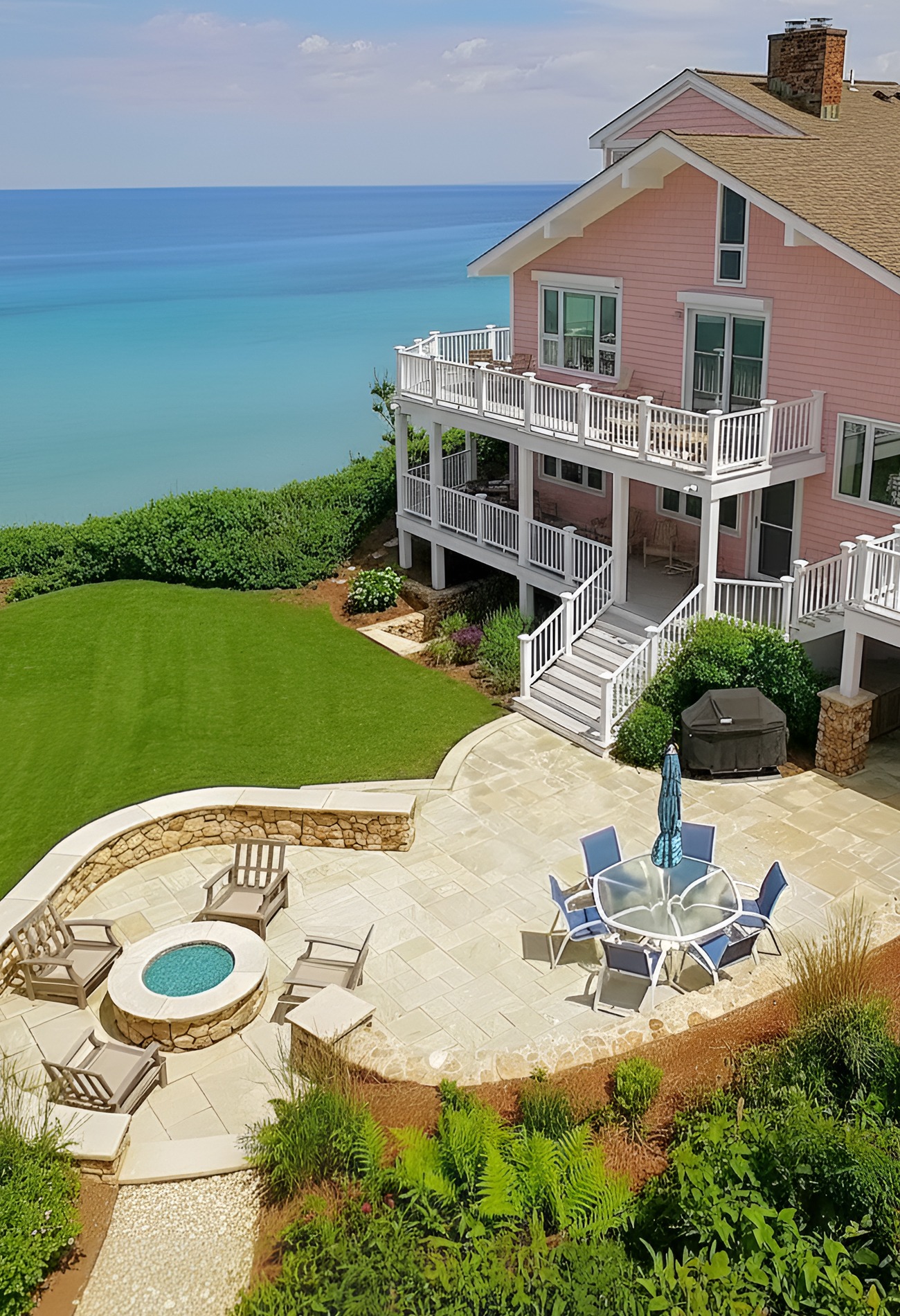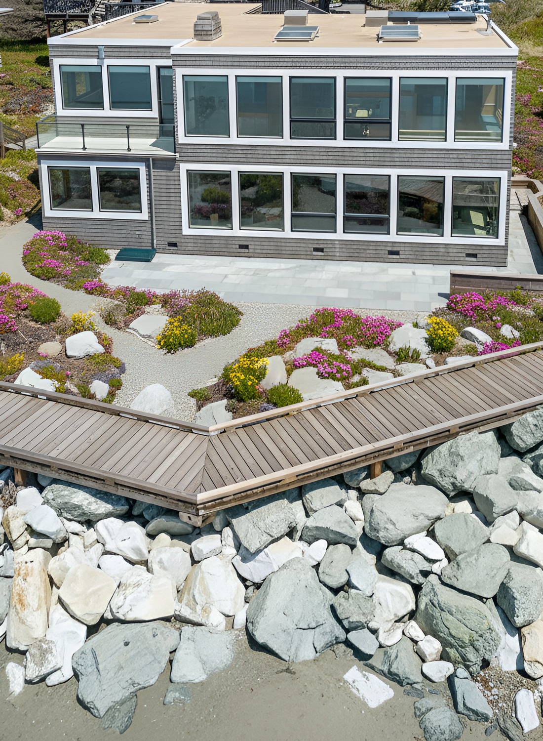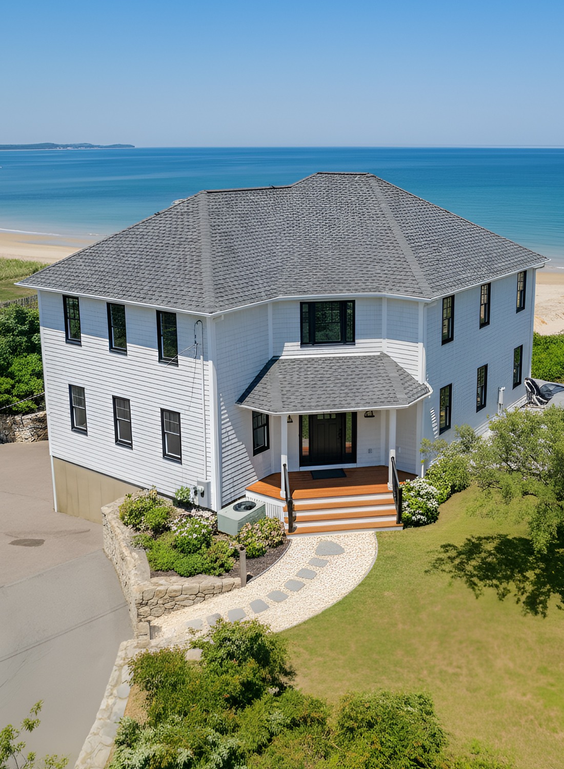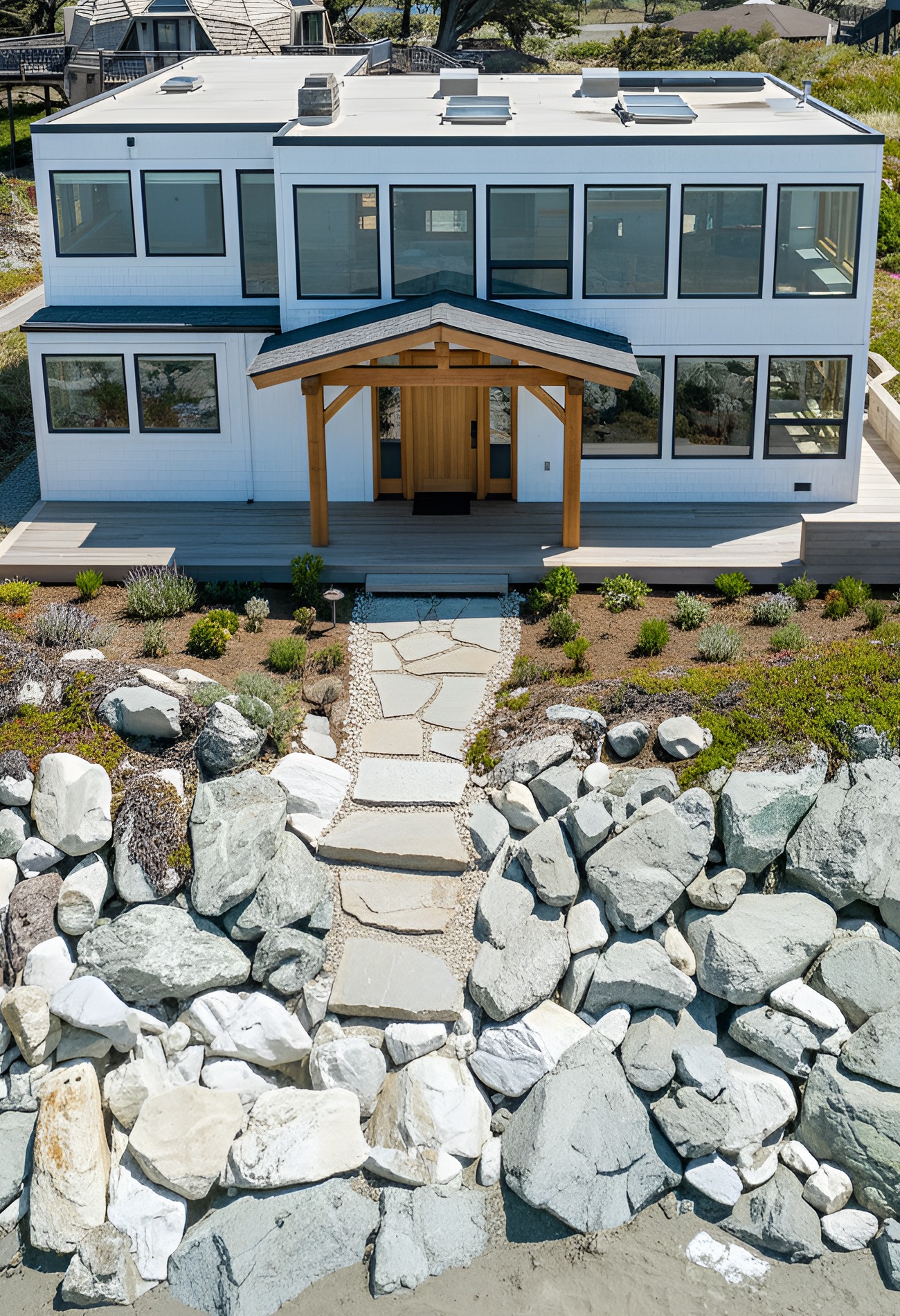 This color works well on almost any beach home style. It can look simple and cottage-like. It can also feel sleek and modern. The key is to layer it with texture. Think board and batten siding, cedar shakes, stone steps, or natural wood beams.
