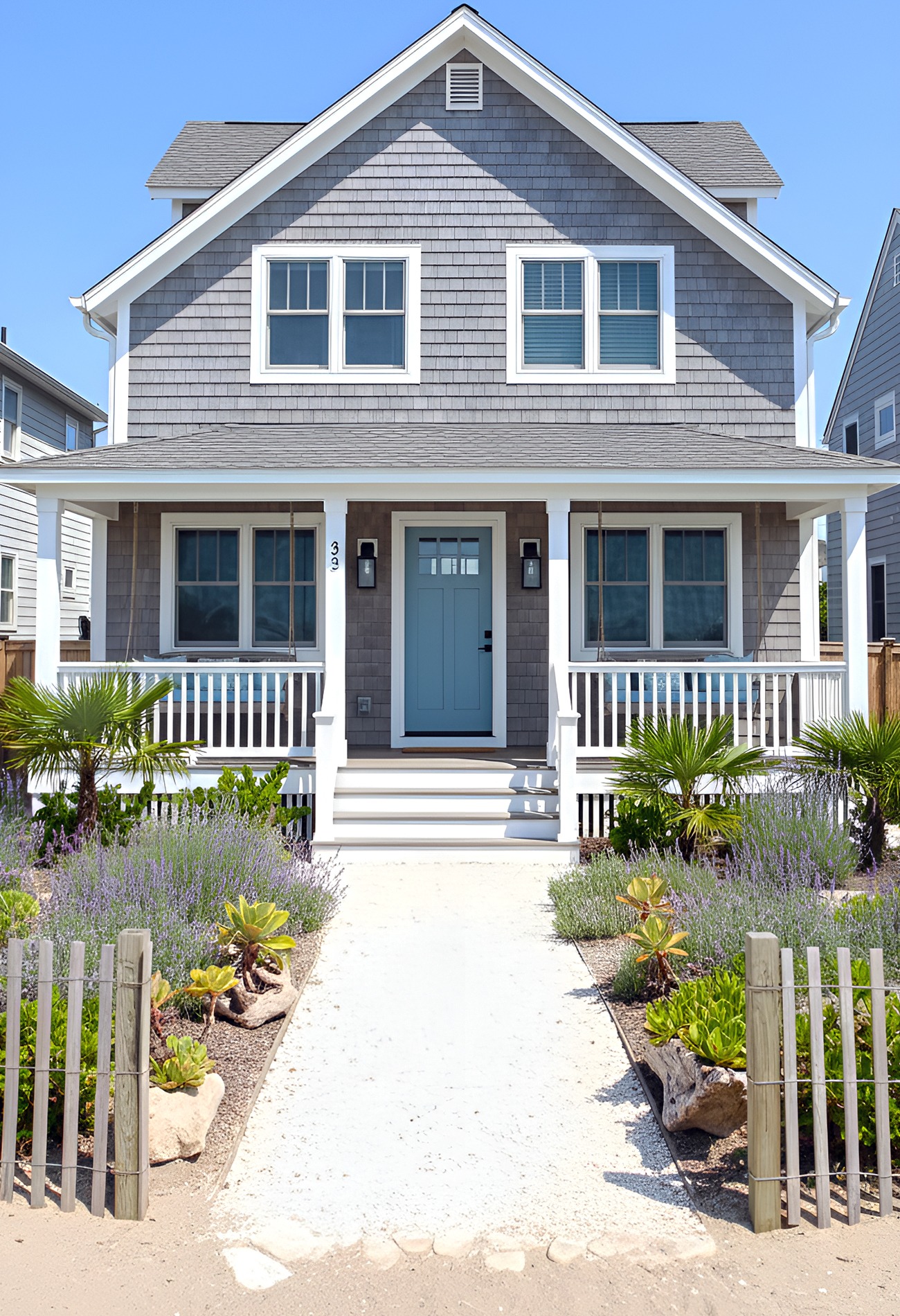 White trim gives it a clean frame. A light gray roof keeps the whole look soft. Add wicker chairs, white planters, and shell paths for easy charm.
