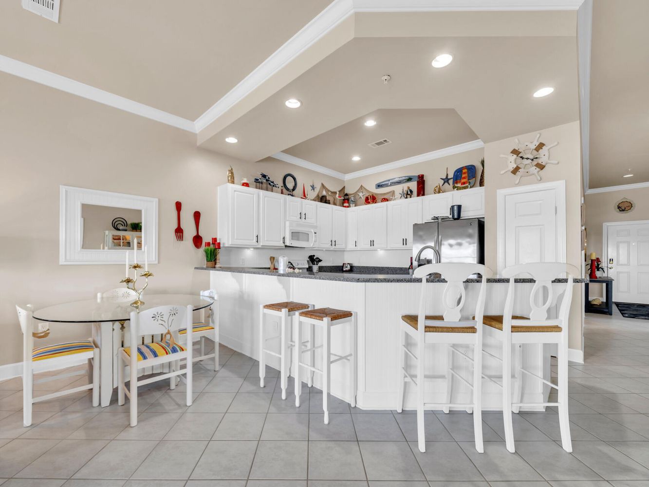 This layout also works hard. The kitchen sits in the back, while a dining set takes the front. That makes it great for smaller homes. Plus, the coastal décor—like the anchor wall piece—adds theme without turning the room into a souvenir shop.