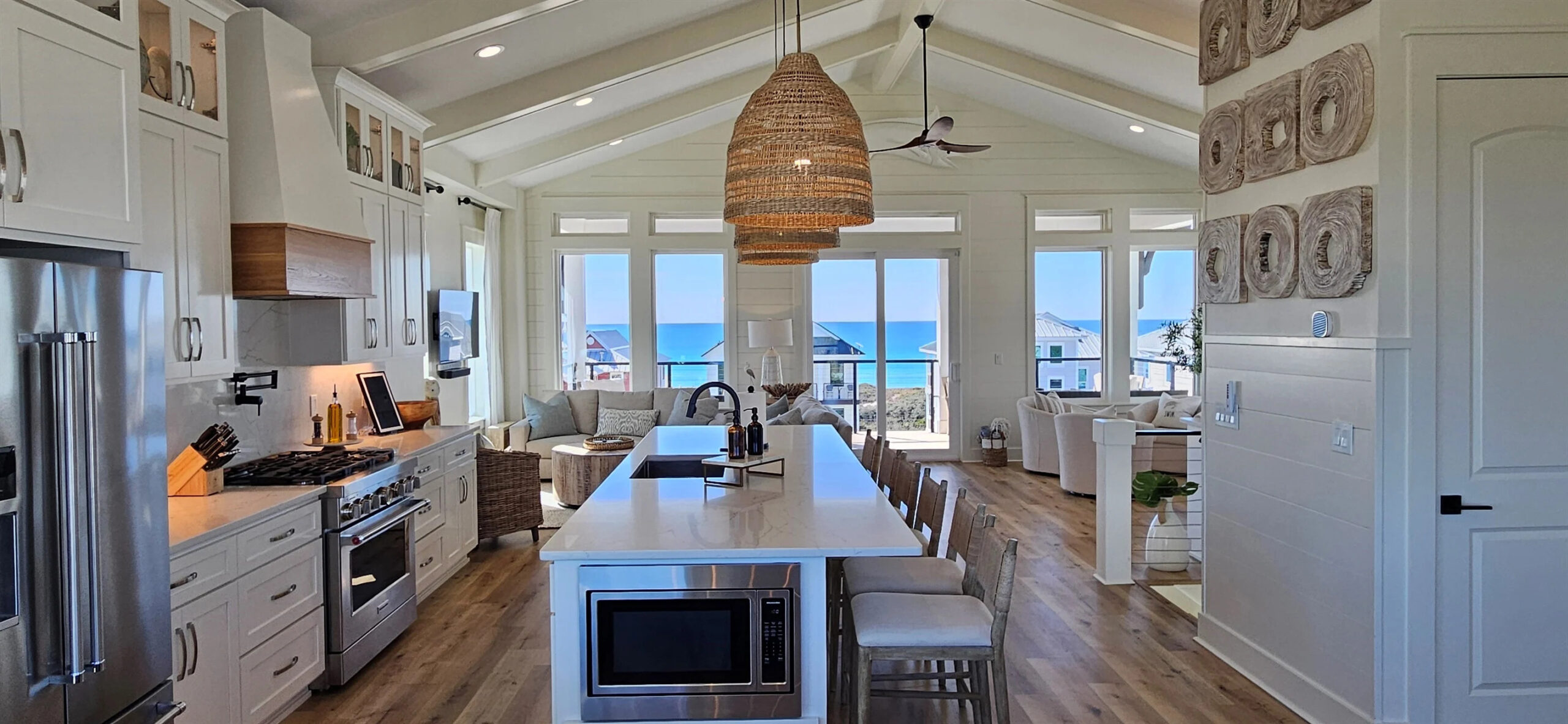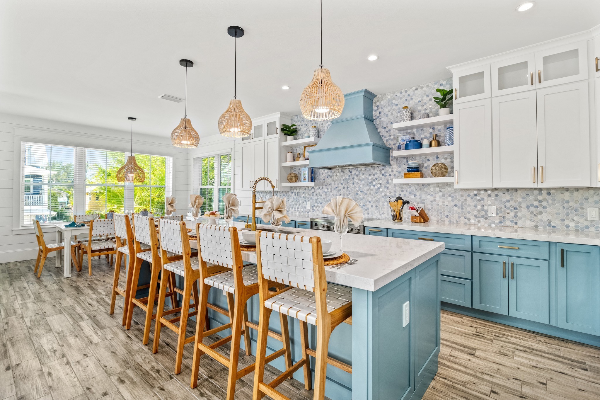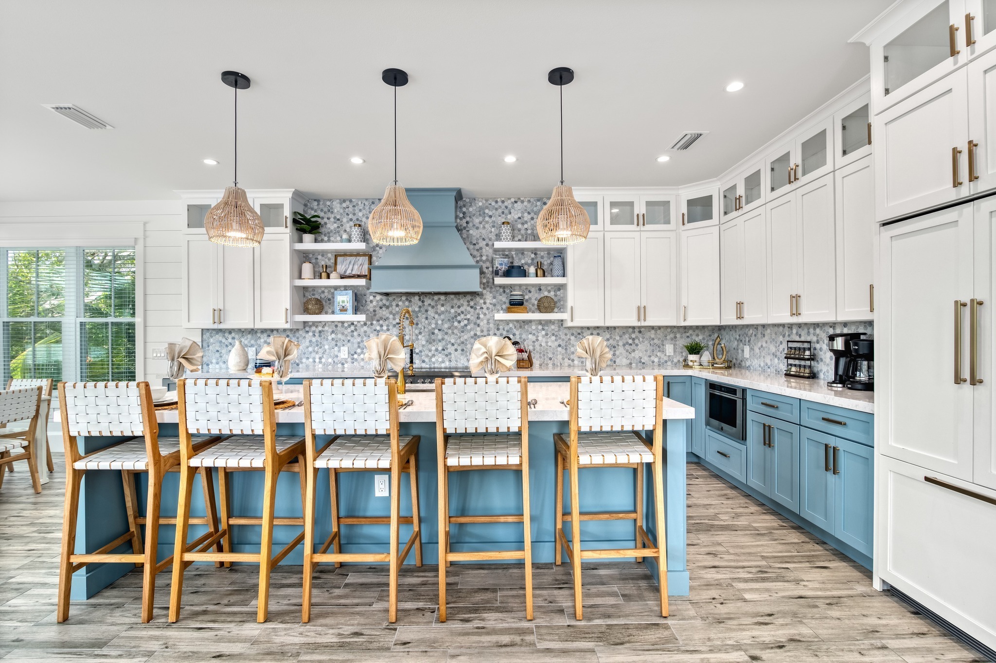 The island sits long and centered, which makes the kitchen feel like a gathering spot. Then the woven pendants repeat that beach texture again, tying the whole look together.