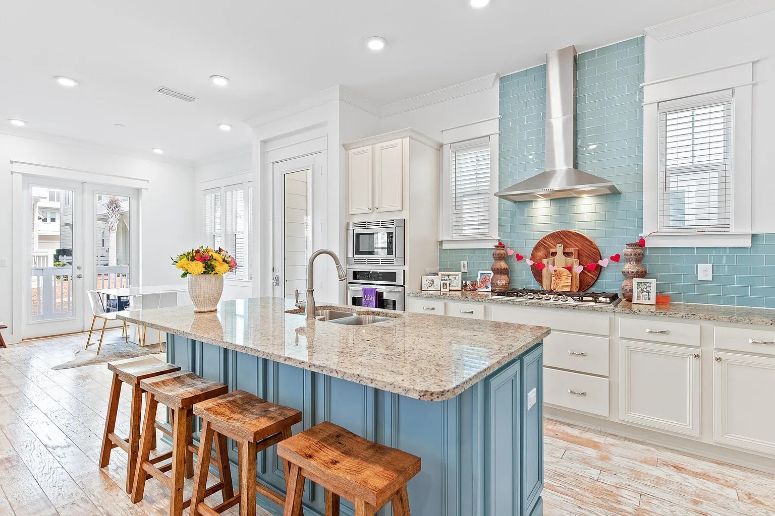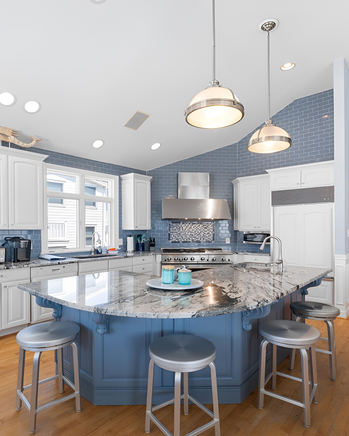 This kitchen feels sunny and cheerful. The tall aqua tile wall draws your eye straight to the range, like a statement backdrop. It feels very “beach boardwalk,” in a crisp, modern way. Then the blue island base repeats the color so it looks planned, not random.