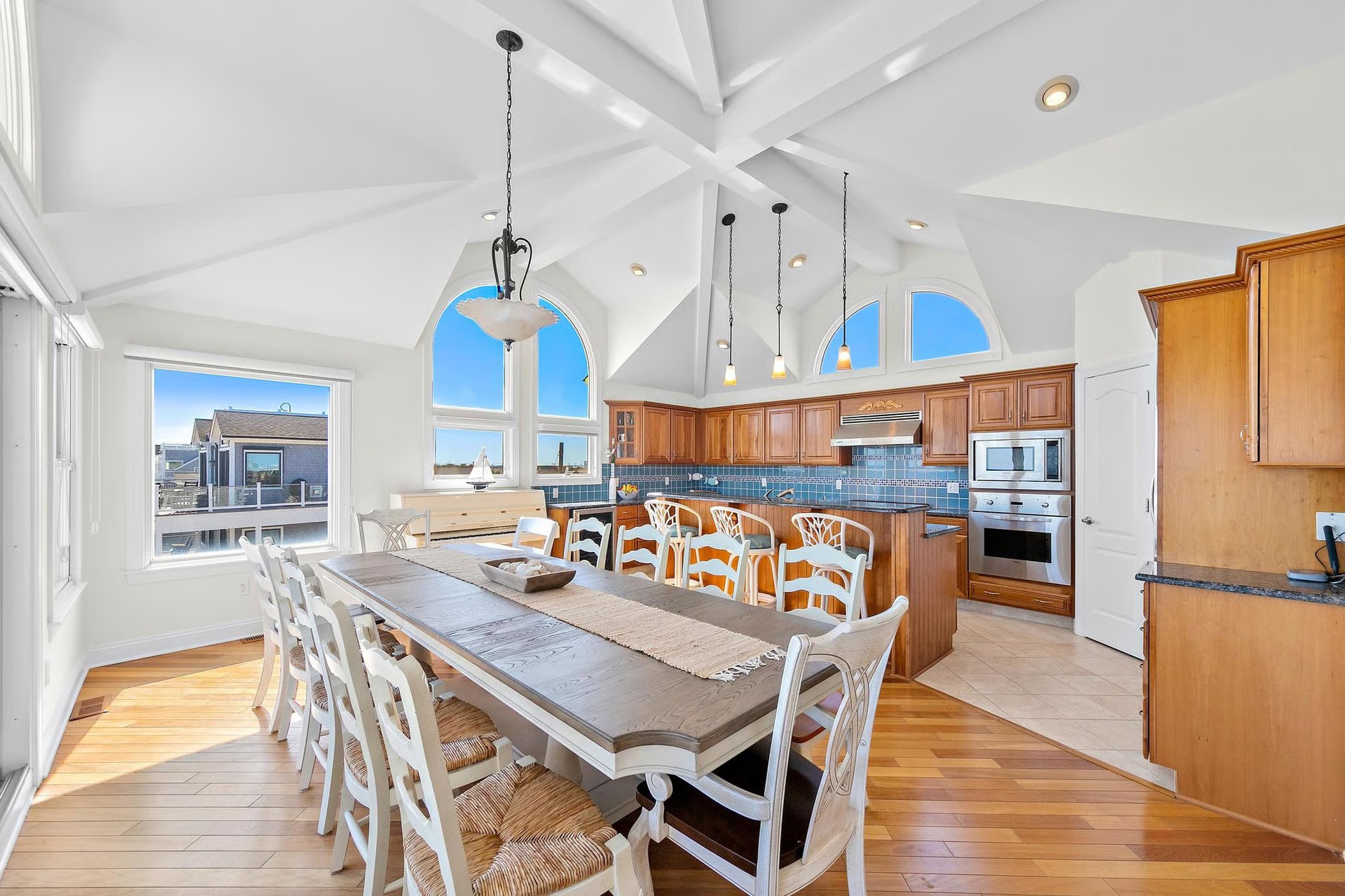 The ceiling is the real showstopper. Those crisscross beams pull your eye up, so the room feels grand and airy. Meanwhile, the large arched windows bring in bright sky views, which instantly reads “coastal.”