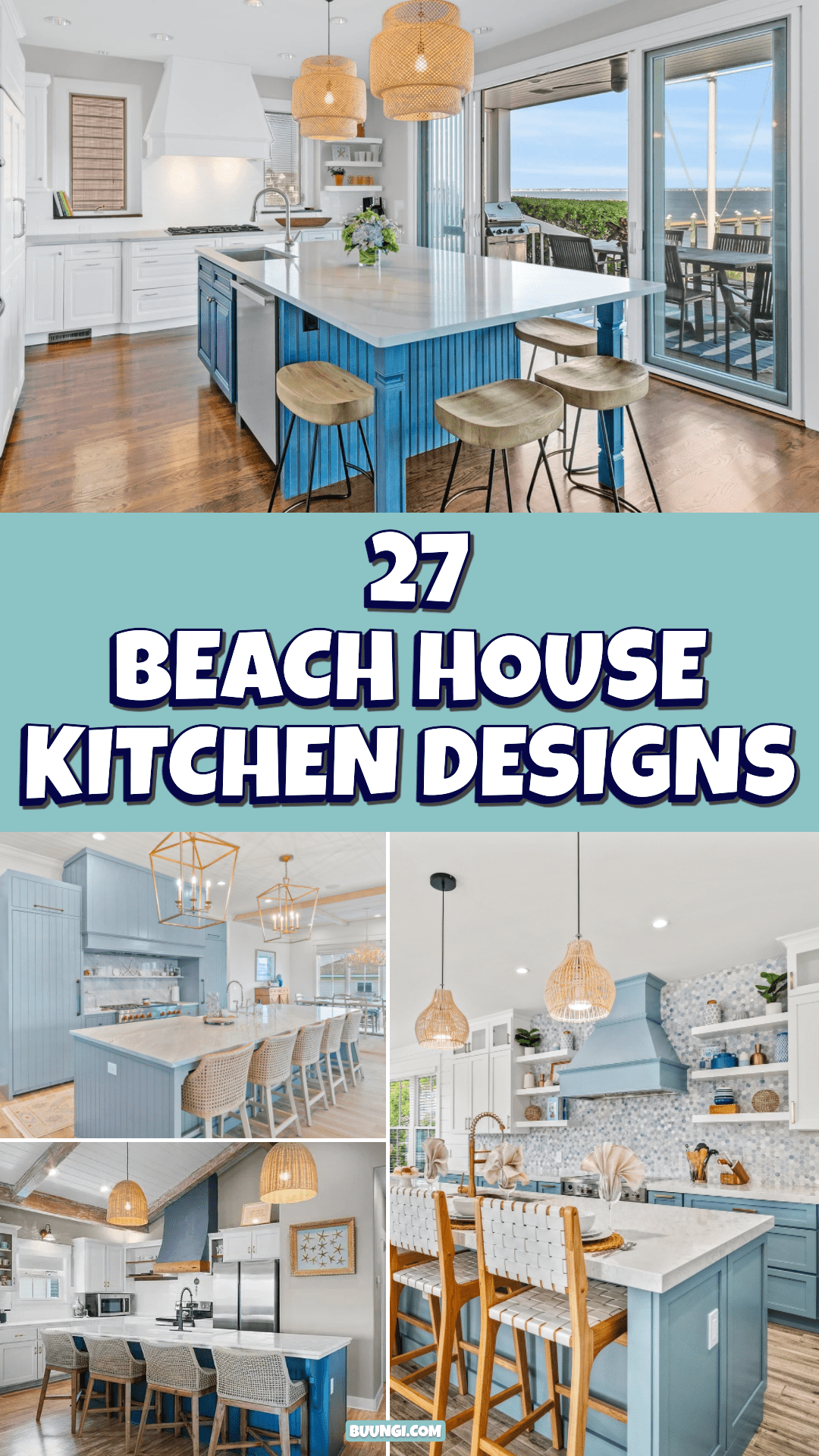 That’s the magic of a great beach house kitchen. It mixes clean whites, sea-glass blues, and warm wood in a way that feels easy and welcoming. Even better, it adds texture—like woven pendants, cane stools, and glossy tile that sparkles like water.