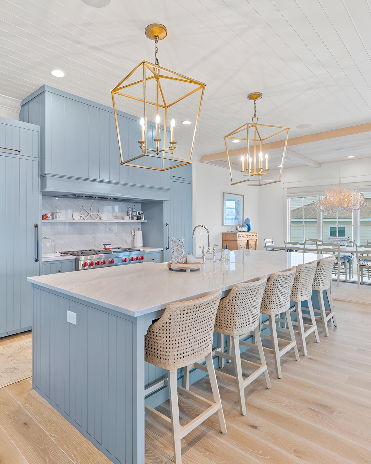 This kitchen feels like a beach resort. The giant blue island looks smooth and strong, and the waterfall-style counter edge makes it feel extra luxe. Then the lantern pendants add that breezy, coastal “hardware” look—clean lines, but still warm.