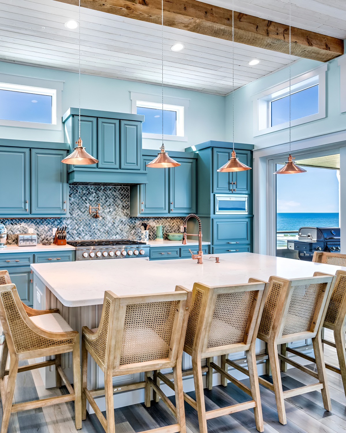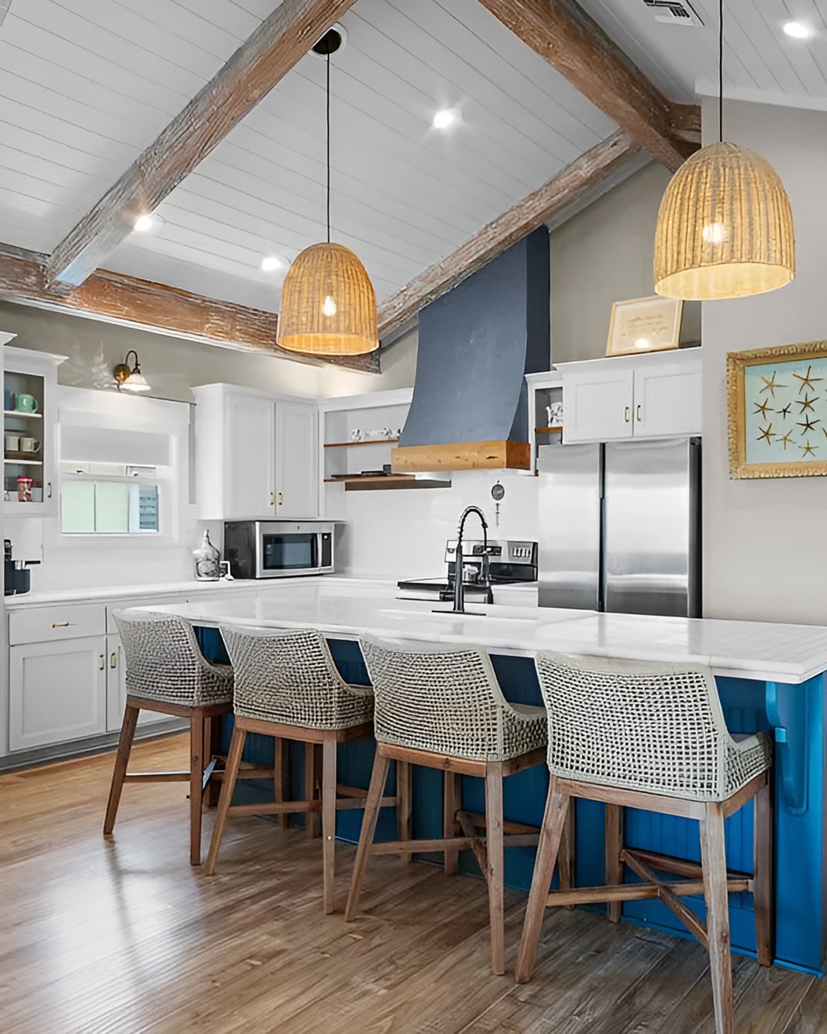 15. Rustic Beams + Bright Blue Island for Modern Coastal Charm