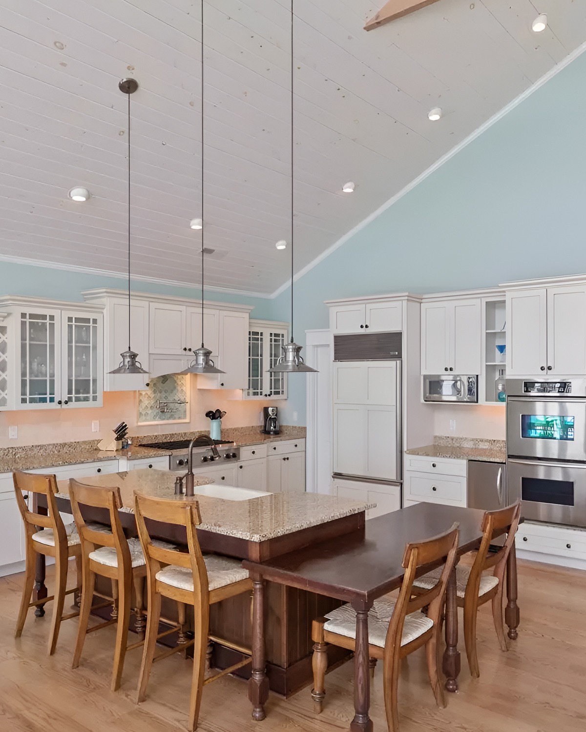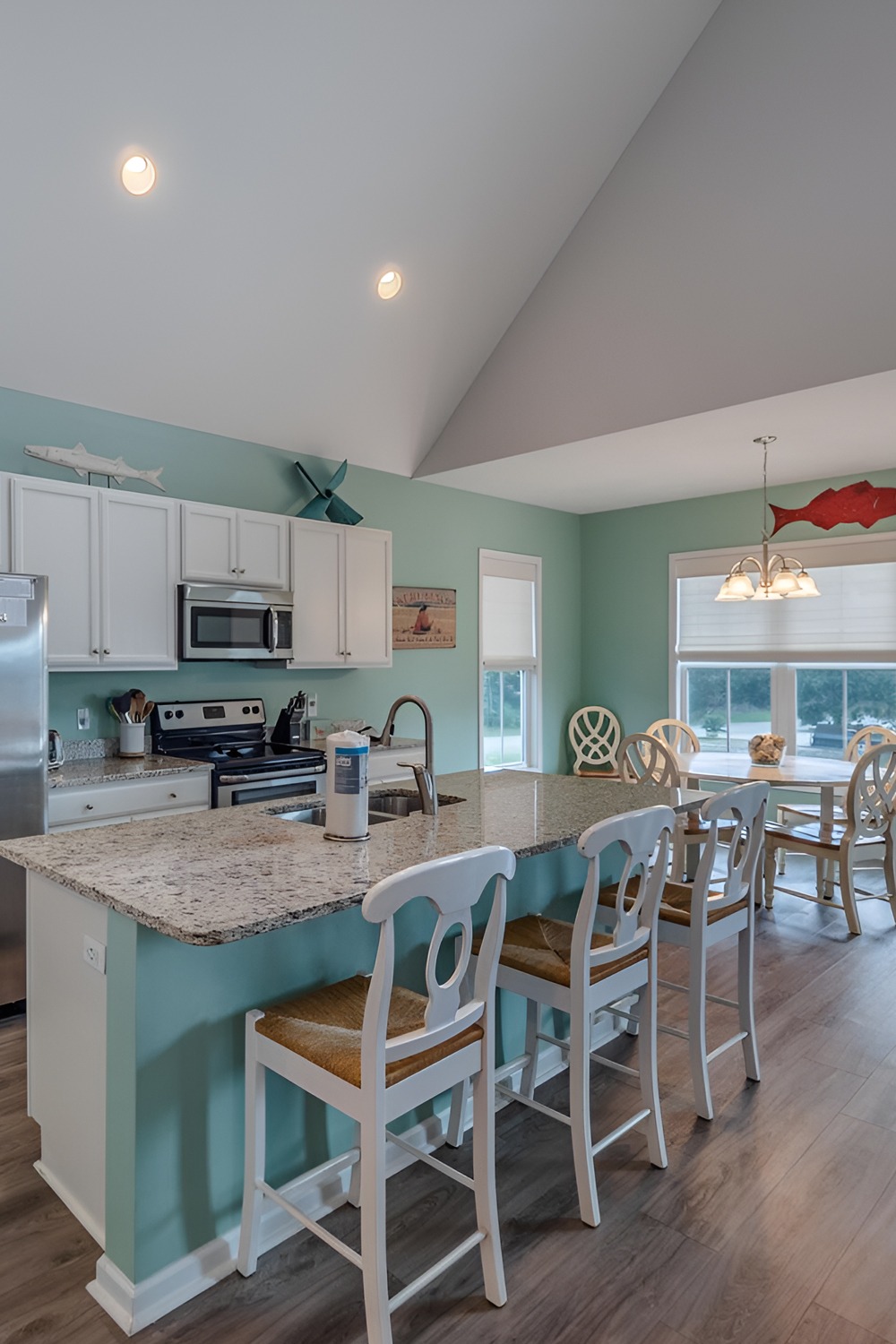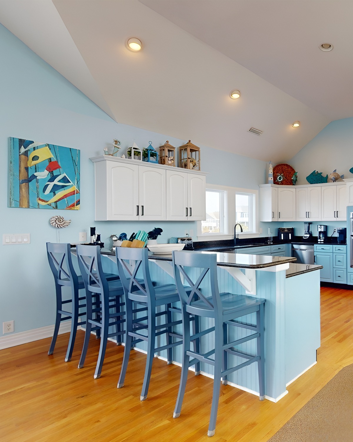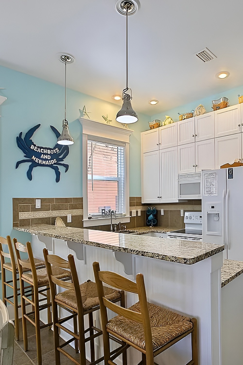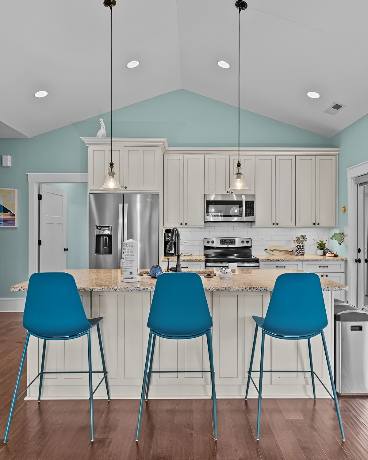 This kitchen leans into fun, and it works. The aqua walls feel like a clear sky. White cabinets keep it bright. Then the raised bar gives you a casual hangout spot, perfect for snacks after the beach.