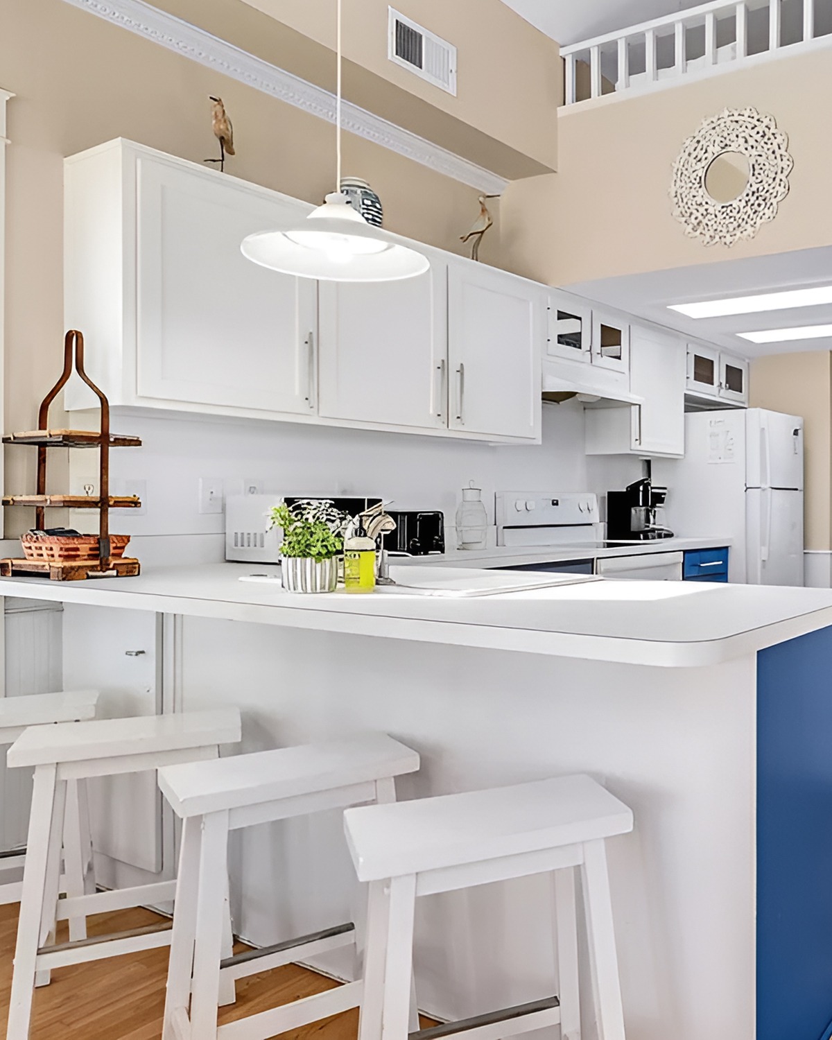 This kitchen proves you don’t need a huge footprint to get a beach-house feel. The white cabinets reflect light, so the room looks bigger. Meanwhile, the blue panel on the peninsula adds that pop of “ocean color” without taking over.