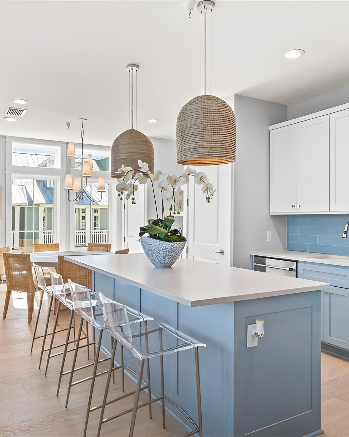 This kitchen feels clean and modern, but still beachy. The pale blue island reads like sea glass. Then the clear acrylic stools practically disappear, which keeps the room feeling open. That’s a smart move in a narrow or open-plan space.