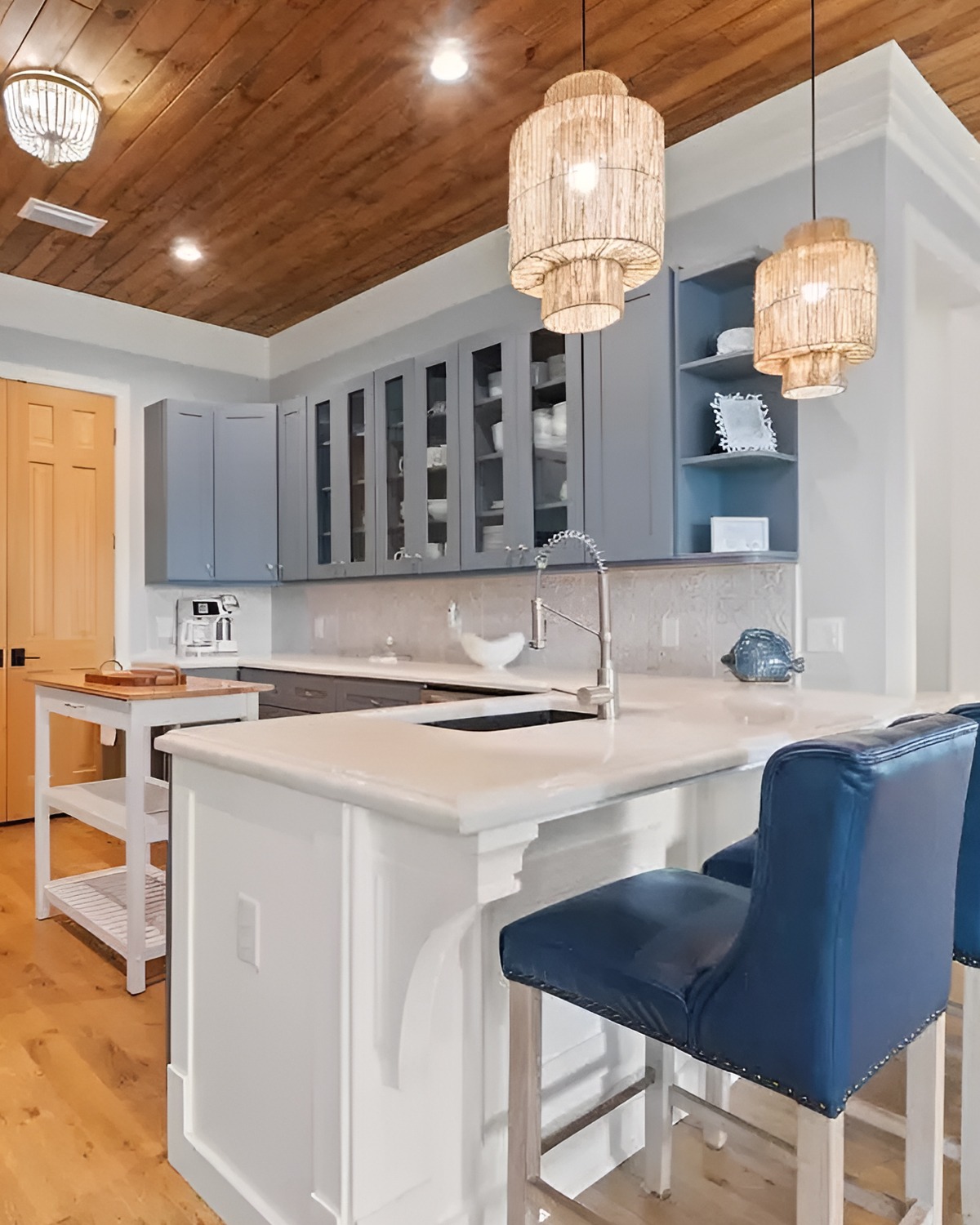 This kitchen balances cozy and coastal. The wood plank ceiling adds instant warmth. Then the blue-gray cabinets bring in a deeper, stormy-ocean vibe. Glass-front uppers also help, because they break up the dark color and add sparkle.