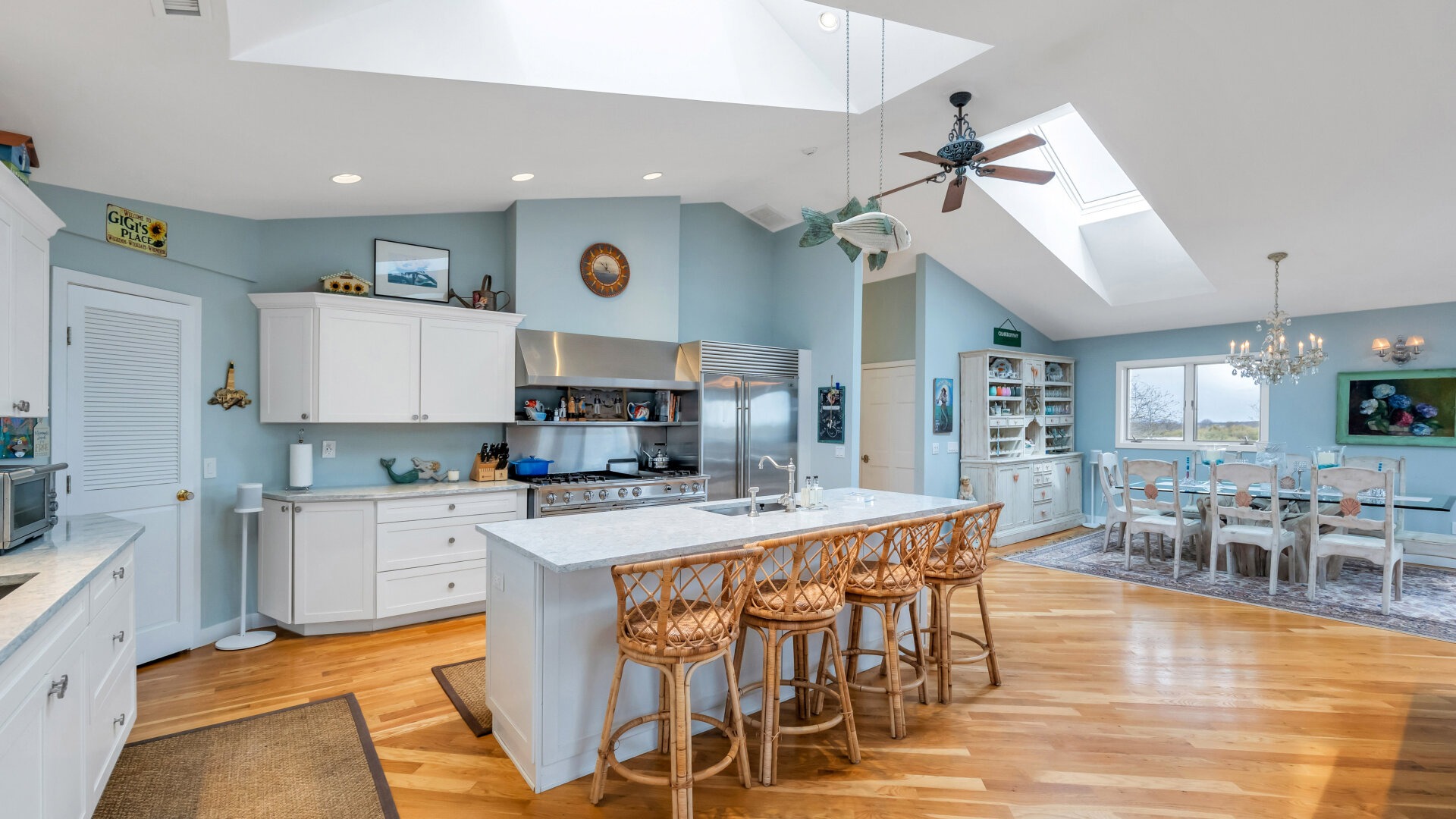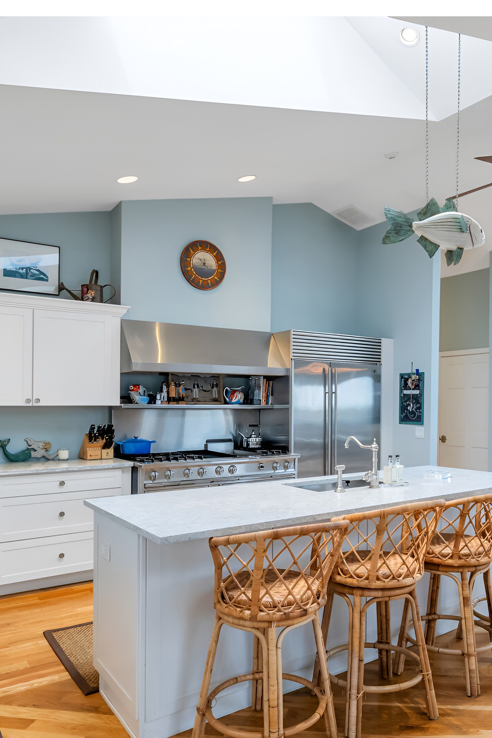 1. Sky-Blue Skylight Kitchen With Wicker Bar Stools