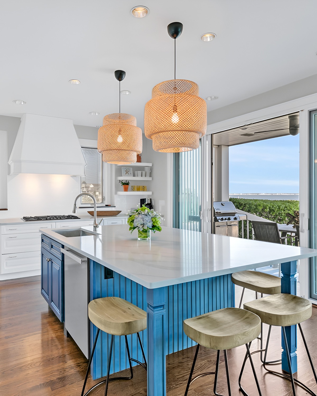 The island stays white, which keeps the room bright. And those blue upholstered stools look comfy, not stiff. The woven pendant lights finish the look with relaxed texture.