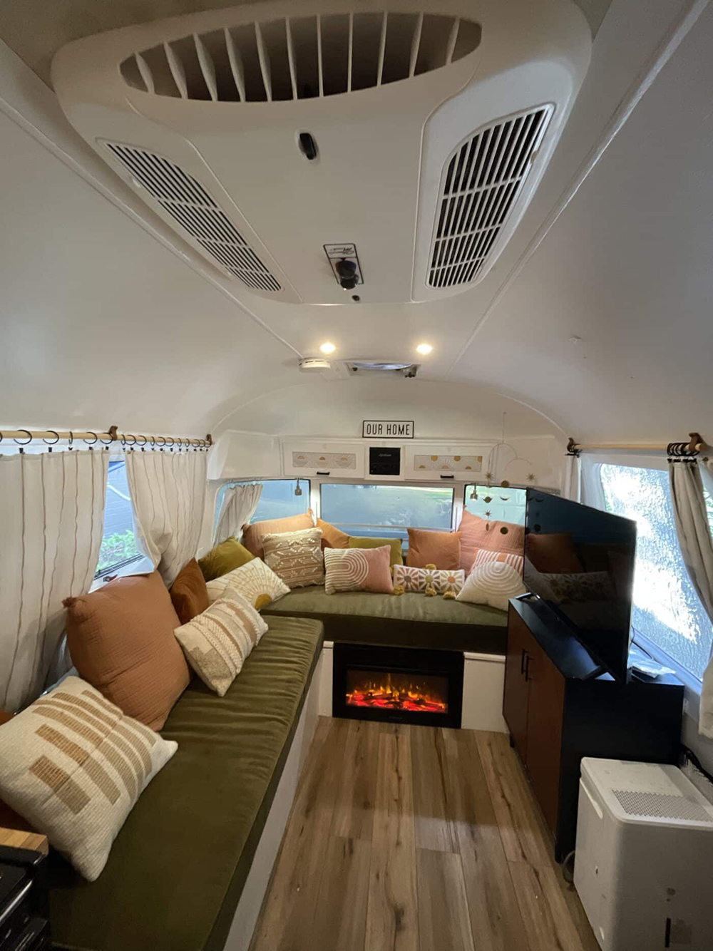 Here’s a space that wraps you in comfort—literally! This Airstream’s lounge is packed with plush pillows in earthy tones and a wraparound bench for lounging or hosting friends. The star of the show? A built-in electric fireplace that brings cozy warmth and a little magic on cool nights. Soft, sheer curtains let in daylight while keeping things private. The TV and media area are ready for movie nights. The soft wood floors and natural textures make it feel like an autumn getaway, all year long.