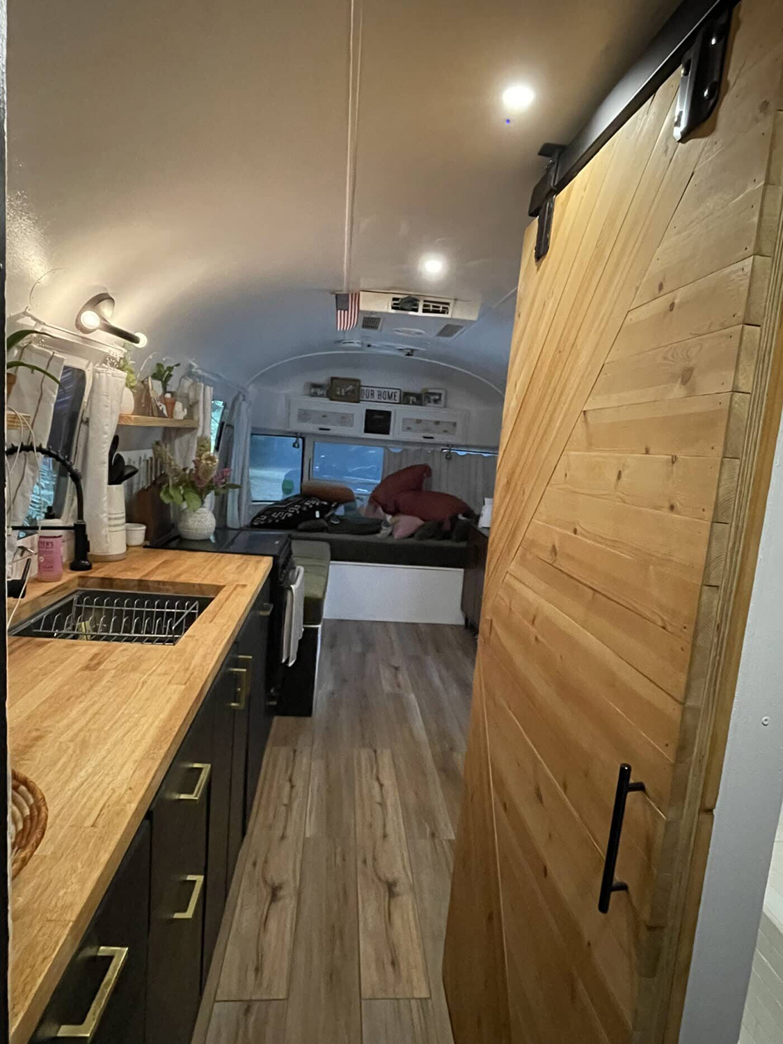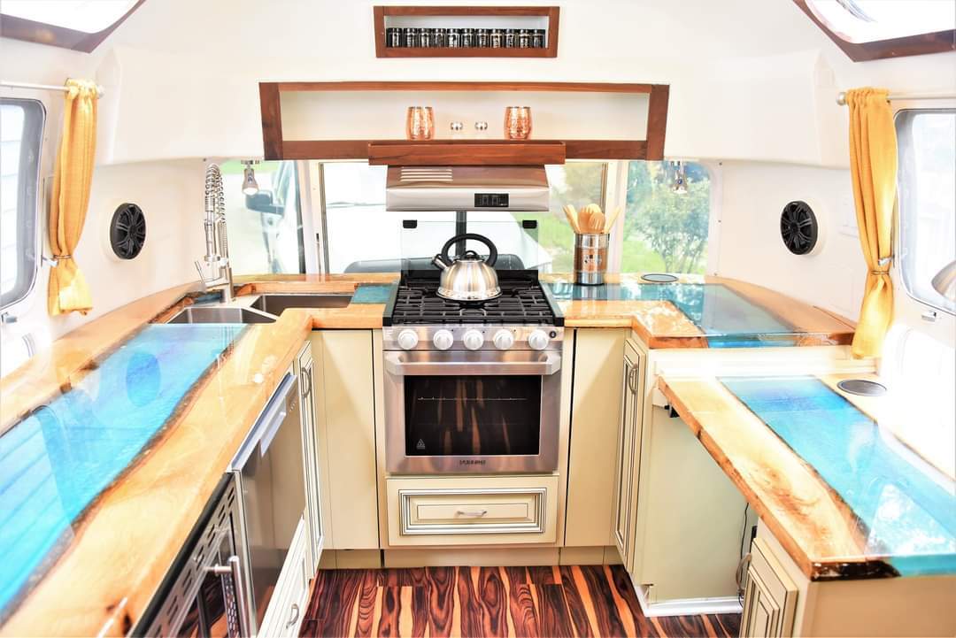 Step into style the moment you slide open that barn door! This Airstream kitchen brings rustic and modern together in such a smart way. The deep black cabinets and sleek brass pulls pop against the rich wood countertops. The wood grain is warm and inviting, making the whole space feel like a tiny farmhouse on wheels. There’s room for plants and a few pretty dishes, but not a bit of clutter. At the end of the galley, a soft lounge area is perfect for lazy mornings or cozy nights in. The sliding barn door isn’t just a space-saver—it’s a statement. This is proof that you don’t need a huge kitchen to create a space that’s both practical and beautiful.