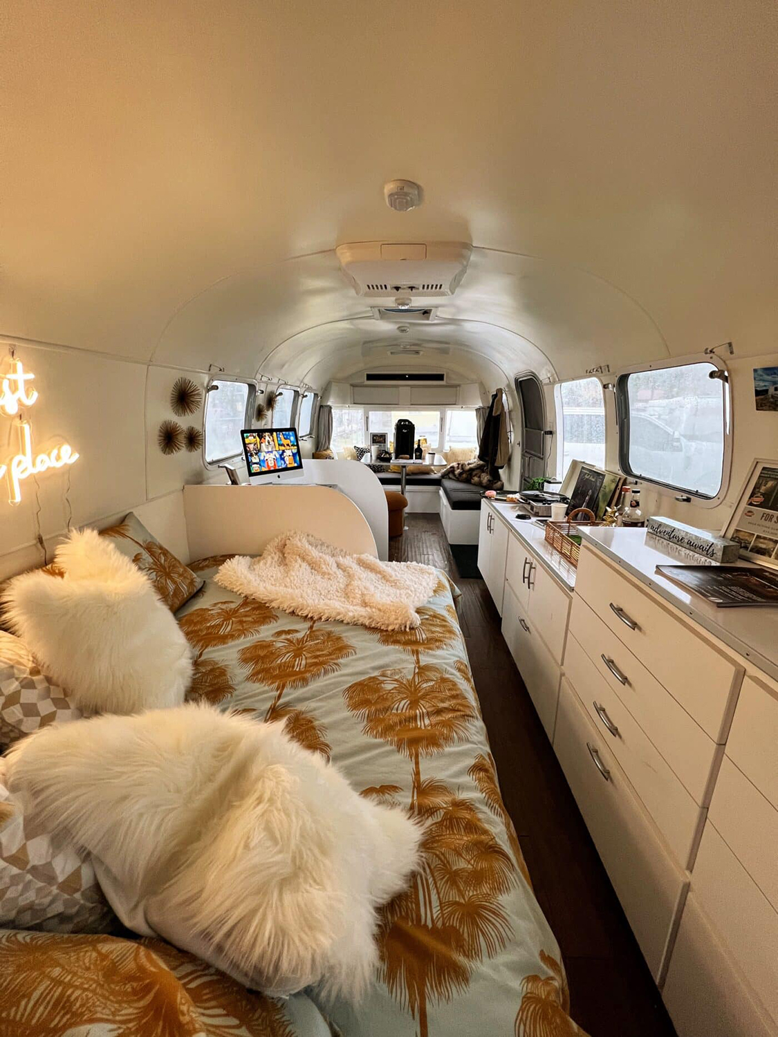 Ever wish you could wake up in a tropical dream? This Airstream makes it happen with palm-print bedding, fluffy pillows, and a glowing neon sign that sets the mood. Along one wall, a long row of white drawers provides tons of storage for clothes, books, and all your travel finds. It’s not just a bedroom—this space doubles as a studio and chill-out zone, with a computer ready for work or play. The natural wood floors add warmth, while the big windows let you watch the sunrise every morning. This is the kind of space where creativity flows and relaxation is easy.