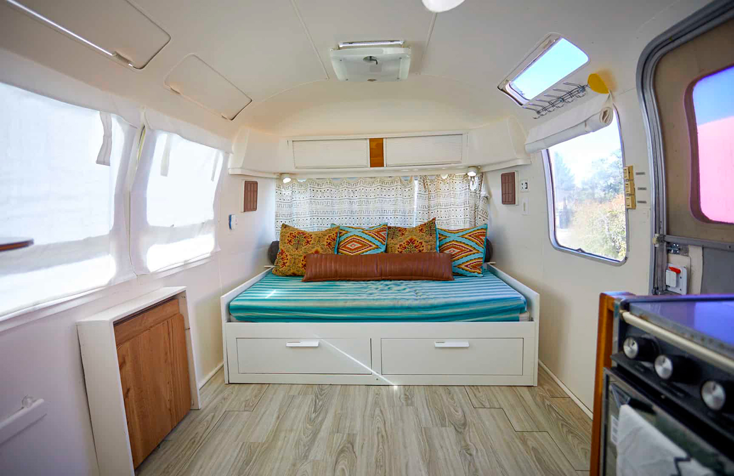 Craving a spot that feels like a mini retreat? This Airstream bedroom nails the look! The daybed with built-in drawers is ideal for storage and naps. Pops of turquoise, rust, and gold in the pillows give it a Southwest-boho vibe. Patterned curtains soften the windows and filter the light for a dreamy glow. The light wood floors make the room feel clean and open. Every detail feels carefully chosen for comfort, style, and a little bit of wanderlust. You’ll want to curl up, relax, and enjoy your own little sanctuary.