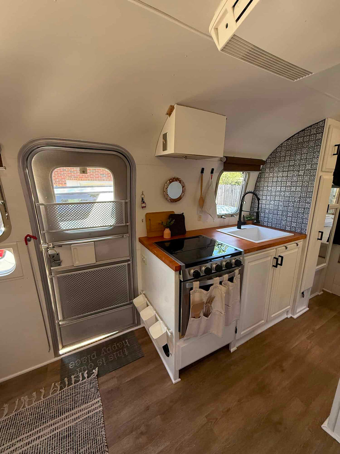 Walk in and feel welcome! The entry kitchen greets you with clean white cabinets and a rich wood countertop. Handy storage bins by the door keep shoes and supplies organized. A compact stove and deep sink make meal prep a breeze, and the round mirror adds a bit of boho charm. A bold, patterned backsplash creates a stylish focal point. Even in a tiny space, every detail has a place and a purpose. This kitchen shows that smart design and a friendly vibe go hand in hand.