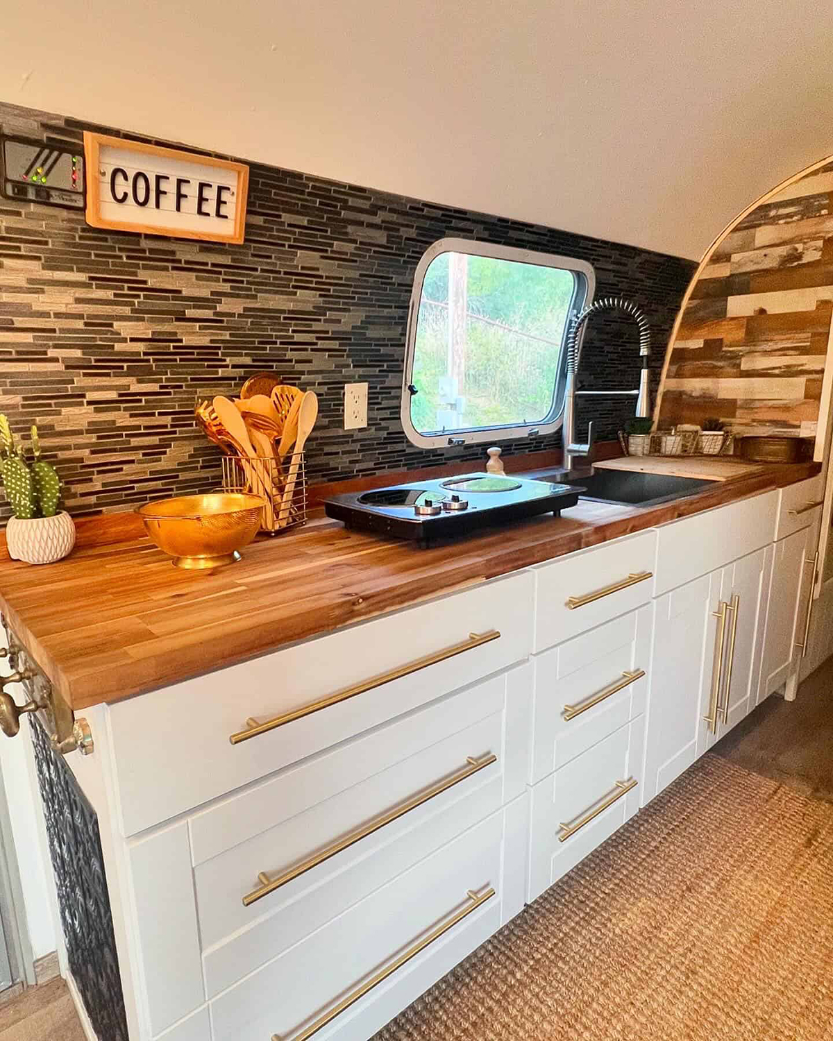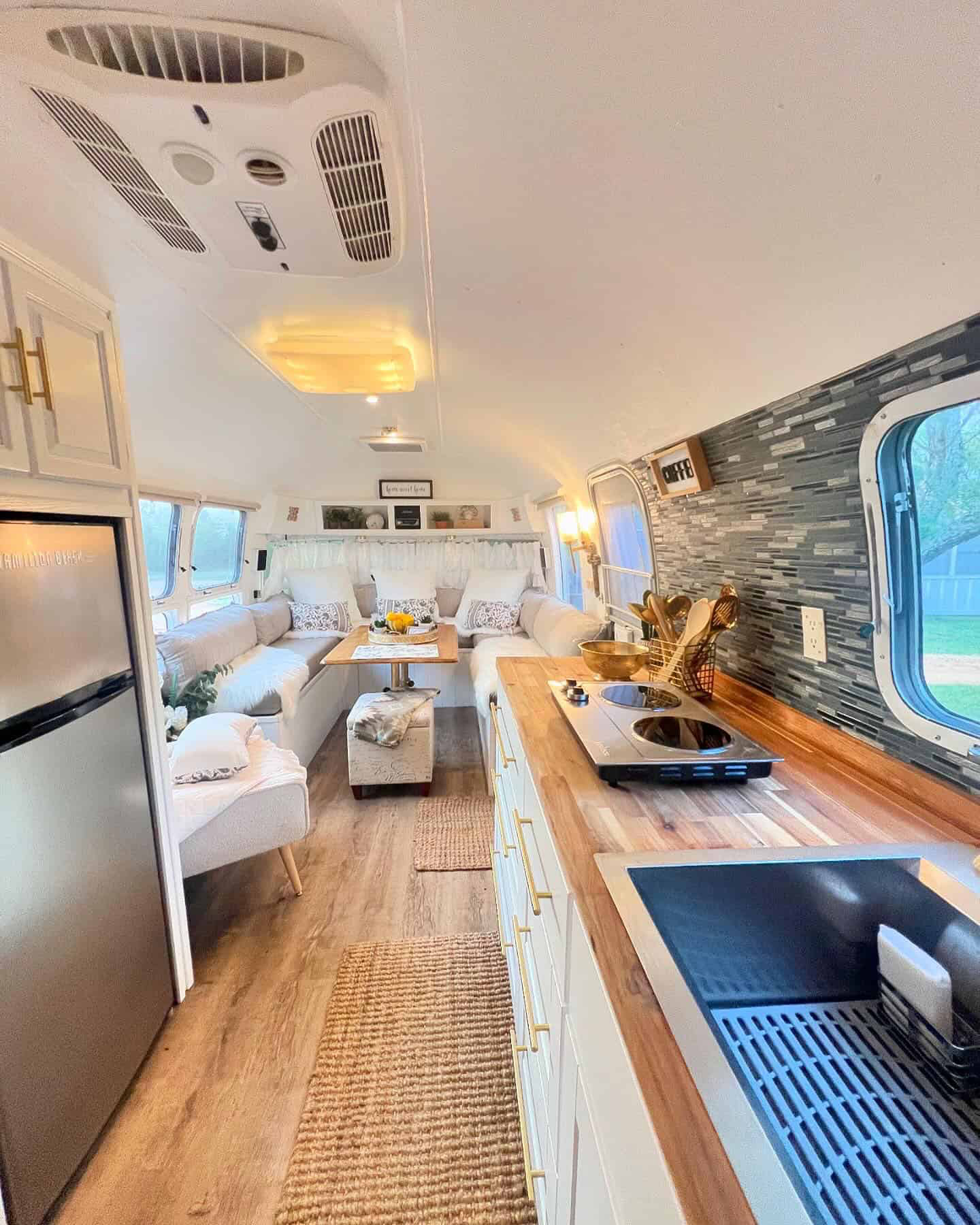 Sunshine and style are the stars in this kitchen! White cabinets with gold hardware give the space a fresh, modern look. The natural wood countertops feel warm and inviting. Look at the backsplash—it brings just the right amount of pattern and texture. The flow is wide open, making cooking and socializing a breeze. This Airstream’s main living area is just steps away, with fluffy seating and soft rugs underfoot. Even the fridge gets a designer touch with its sleek silver finish. It all comes together for a vibe that’s relaxed, cheerful, and oh-so-boho chic!