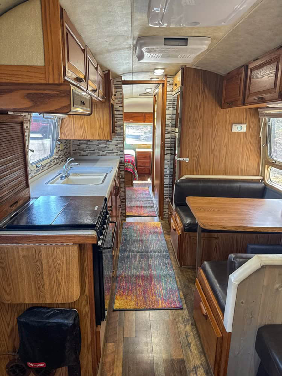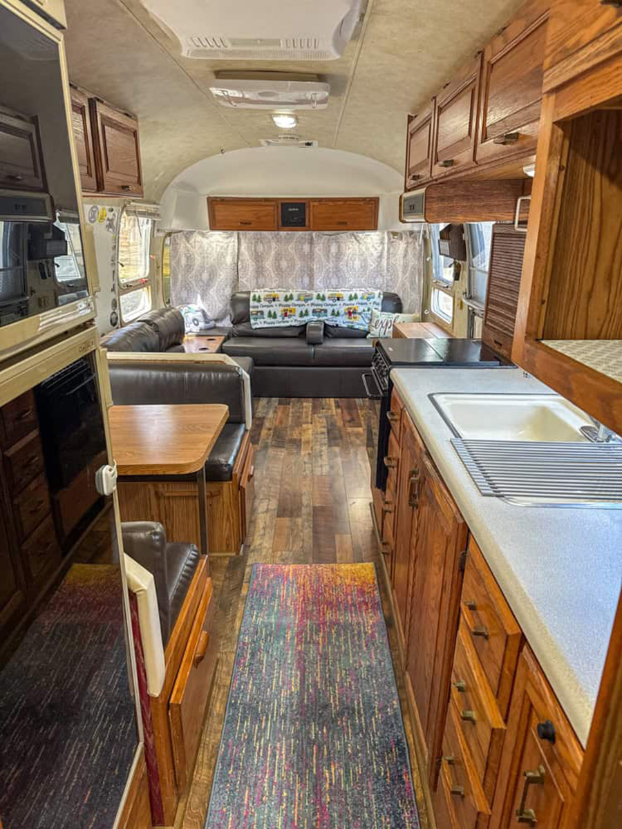 Step back in time, but keep all the comforts of today! This Airstream uses rich wood cabinetry and fun retro touches to create a nostalgic, homey feeling. The kitchen is packed with storage, and the colorful runner adds a dash of personality. The cozy dinette and matching sofa invite you to linger over coffee or play cards with friends. Subway-style backsplash and updated fixtures keep the look fresh without losing the classic charm. At the end of the trailer, you’ll spot a snug sleeping nook ready for sweet dreams. This space proves vintage style never goes out of fashion—it just gets better with age!