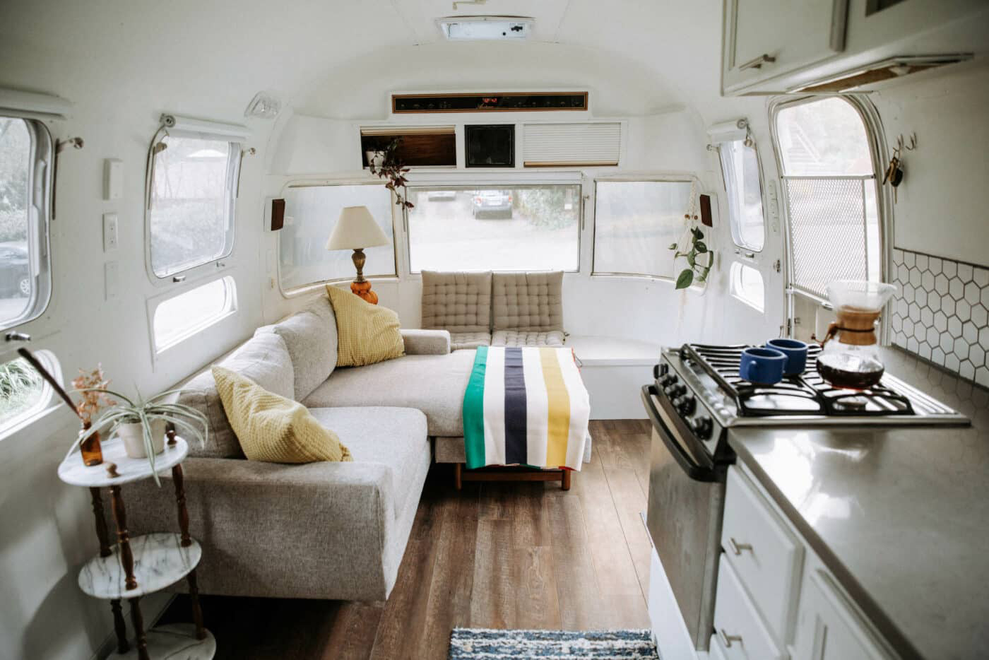 Ready to kick back? This Airstream lounge makes relaxing look so easy. A soft gray sectional takes center stage, perfect for curling up with a book or stretching out for a nap. Big windows let the sunshine pour in, bathing the room in a soft, happy glow. Pops of color from the striped blanket and yellow pillows keep things bright and cheerful. Plants and simple decor give the space life and personality. The honeycomb backsplash in the kitchen adds a fun, modern twist. This is the kind of place where you want to stay awhile and enjoy every moment.