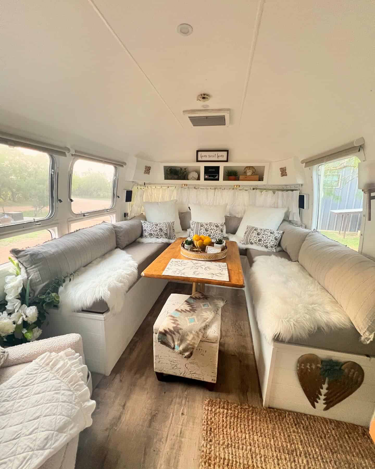 Step into comfort and style! This Airstream dinette feels like a warm hug the moment you walk in. The wraparound benches are plush and loaded with fluffy pillows, so you can kick back, chat, or enjoy a lazy brunch. Soft fur throws add a touch of luxury and warmth, making the space feel even more inviting. The natural wood table is the heart of the setup, ready for family games or a delicious spread of snacks. Big windows flood the space with sunlight, making the whole area feel open and airy. Cute touches—like the little “Home Sweet Home” sign and curated shelves—add a personal feel. Even the floor is stylish, with wood tones that tie the whole room together. It’s proof you can turn even a small space into a dreamy retreat!