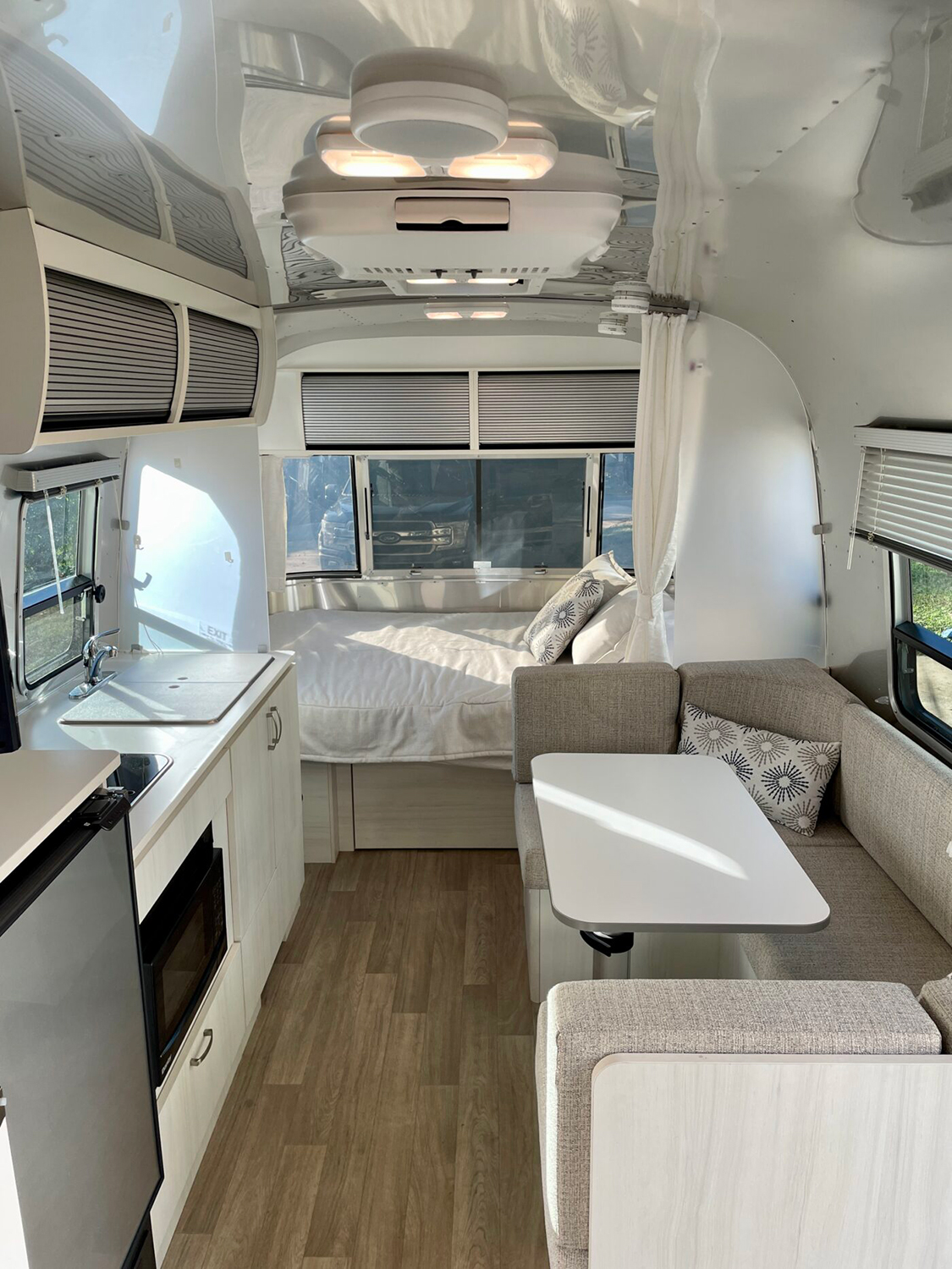 Step into a breath of fresh air! This Airstream keeps it classic with a palette of white and soft gray. Light bounces around the high-gloss ceiling, making the whole place shine. The U-shaped dinette and bed at the back create two cozy zones for lounging or sleeping. Minimalist cabinets and neutral fabrics keep things tidy and simple. There’s plenty of sunlight and just the right touch of softness in the pillows. It’s the ultimate in laid-back comfort.
