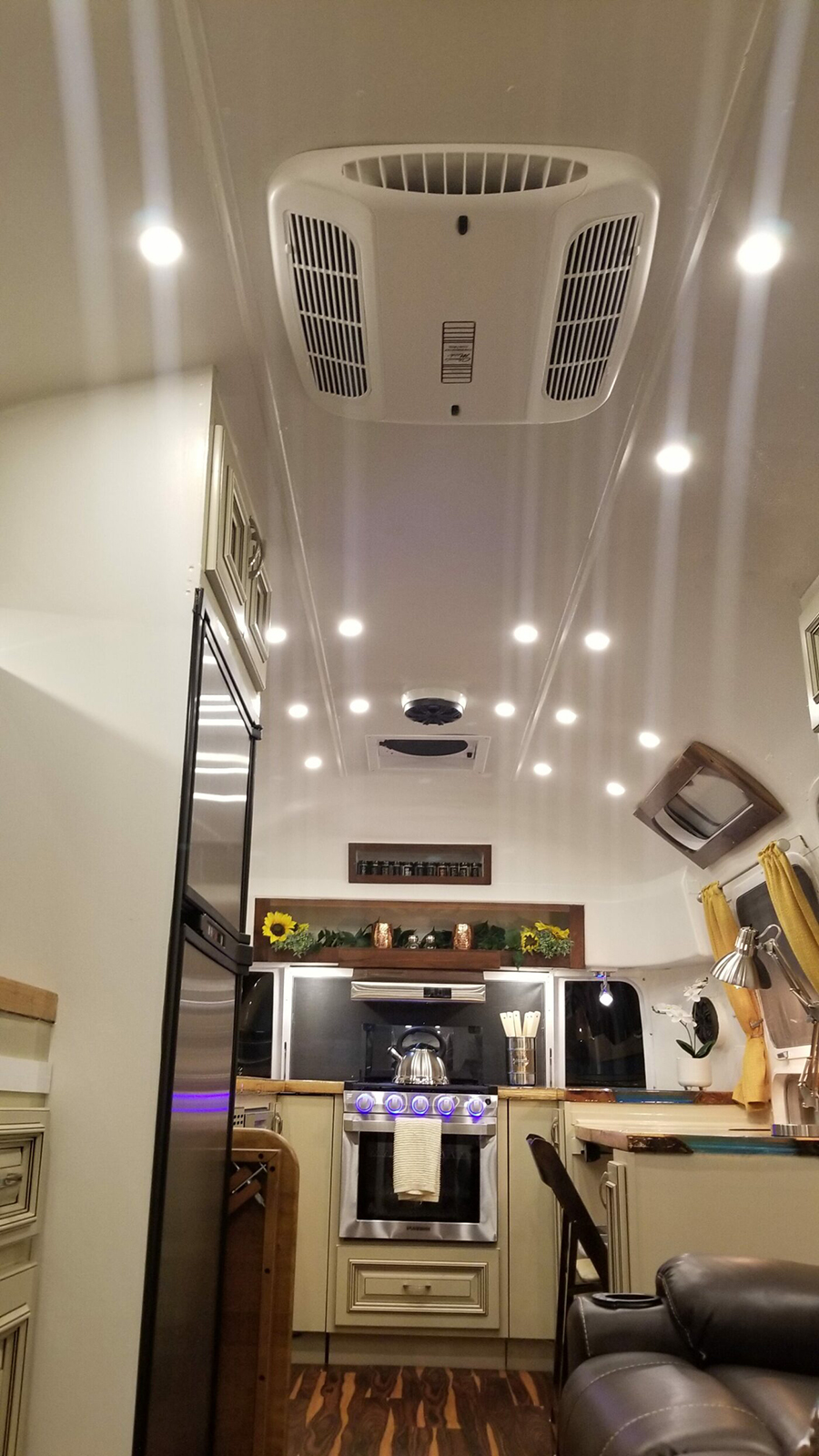 Love a little glamour after dark? This Airstream glows with cozy lighting. Rows of recessed lights along the ceiling make the whole space sparkle. The kitchen features cream cabinets and elegant hardware, plus a stylish range with glowing blue dials. Pops of color from sunflowers and copper pots add warmth and charm. The seating area in the foreground invites you to sink in and relax. Dark wood floors finish the look, making this trailer feel as inviting at midnight as it does at noon. This is farmhouse style with a twist—perfect for anyone who loves to entertain!