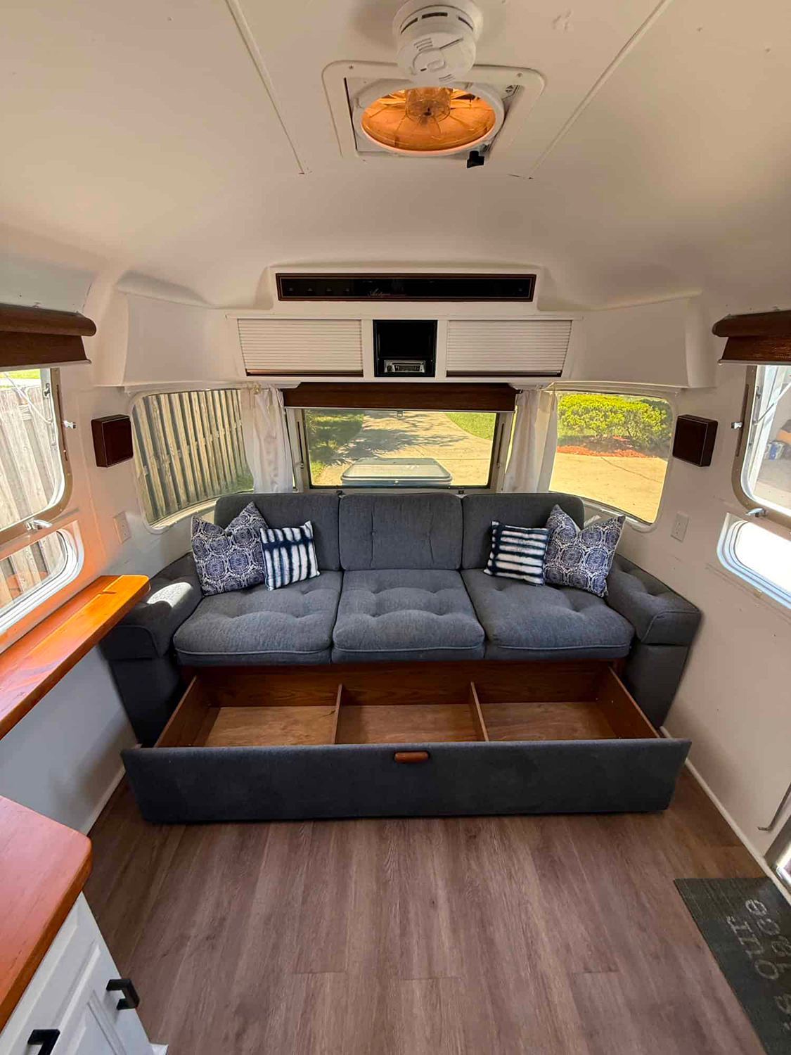 Looking for secret storage? This Airstream has it! The plush gray sofa hides deep drawers underneath, so you can stash blankets, books, or even shoes. Wide windows fill the room with daylight, while crisp white walls keep the vibe fresh and modern. Accent pillows in blue and gray add a graphic punch. The combo of comfort and smart design makes this spot perfect for road trips or everyday living.