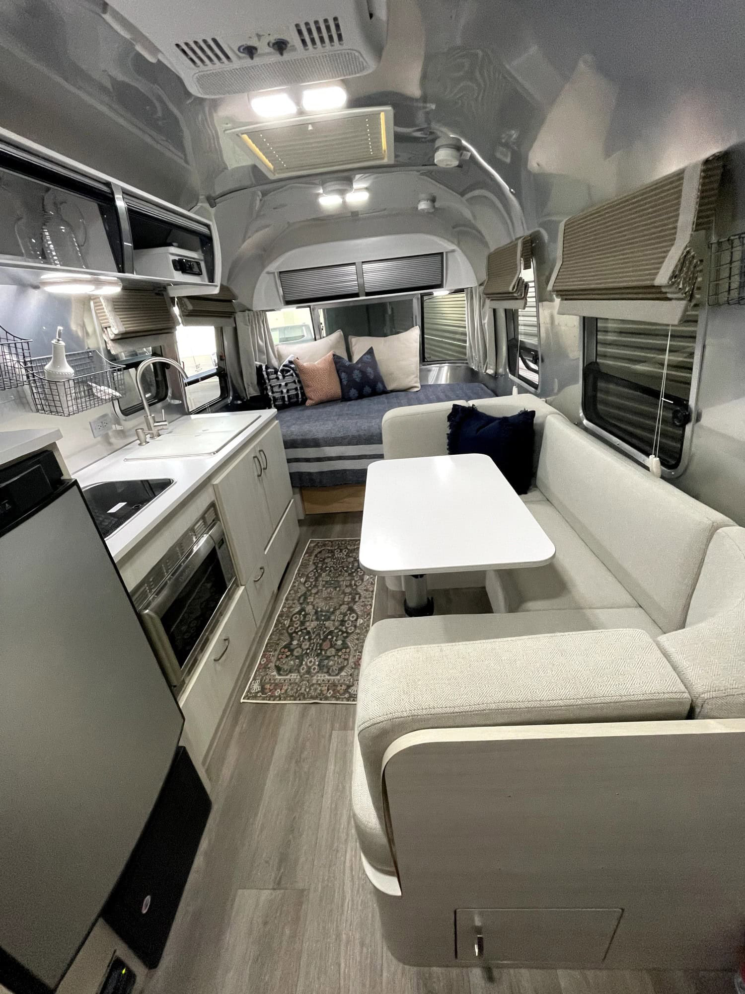 Come inside and breathe easy! This Airstream interior feels fresh, bright, and oh-so-inviting. The light-toned cabinets and neutral seating keep everything open and cheerful. A splash of navy in the pillows adds a stylish touch, while the window shades control sunlight and keep things private. The bed at the back is dressed with layers of soft fabric, creating a retreat you’ll never want to leave. Even the kitchen area feels open, thanks to clever storage and a compact layout. It’s proof that less really can be more!