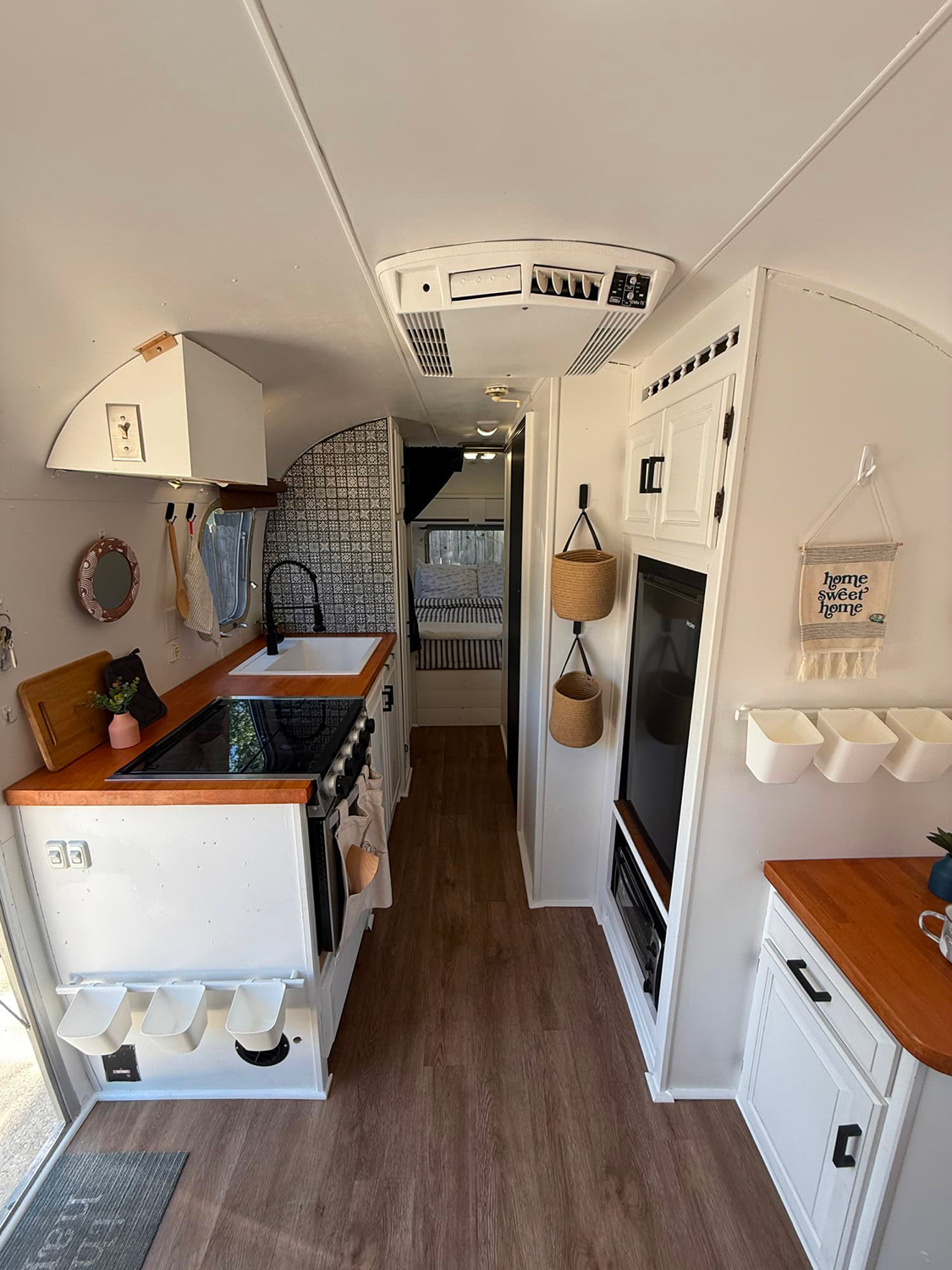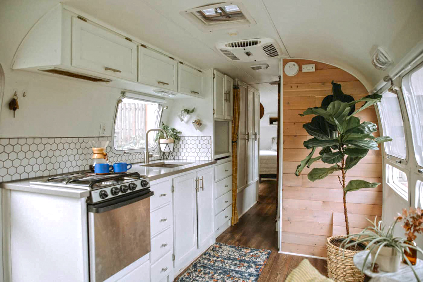 This Airstream channels pure Scandinavian calm. Crisp white cabinets, hex tile backsplash, and pale wood accents keep the kitchen light and airy. The clean lines make the space feel organized and relaxing. A touch of nature, like the potted plant and woven basket, brings in warmth and softness. The living area flows right into the bedroom for a seamless, open feel. The soft rug and a splash of greenery finish the look. It’s a peaceful oasis that proves you don’t need much to feel at home—just smart design and a few cozy touches!