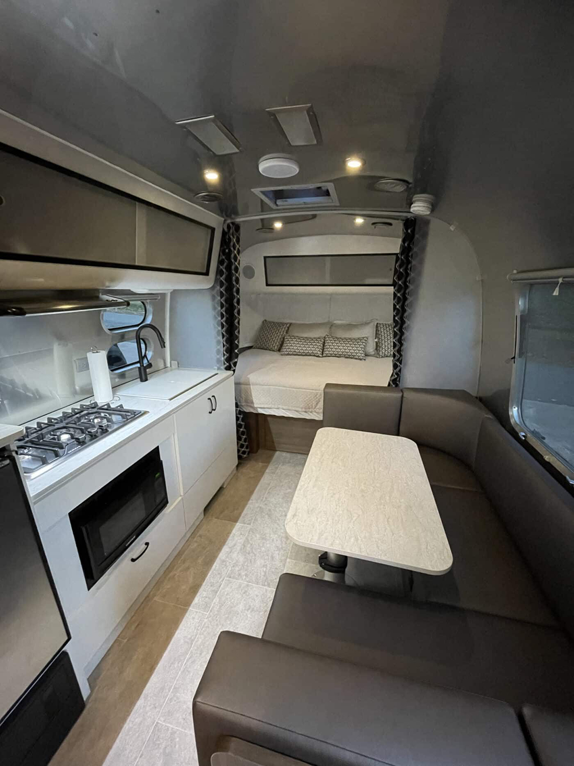 Ready for some serious modern vibes? This Airstream nails it with a mix of soft, deep tones and smart lighting. The dark cabinets, glossy ceiling, and sleek lines give it a cool, moody look. The U-shaped dinette is perfect for dinner, work, or a game night with friends. At the back, the bed is tucked in with cozy pillows and patterned curtains for privacy. Every finish is clean and smooth, with a high-gloss shine that makes the space feel luxe. This is how you do cozy and modern, all in one small footprint.