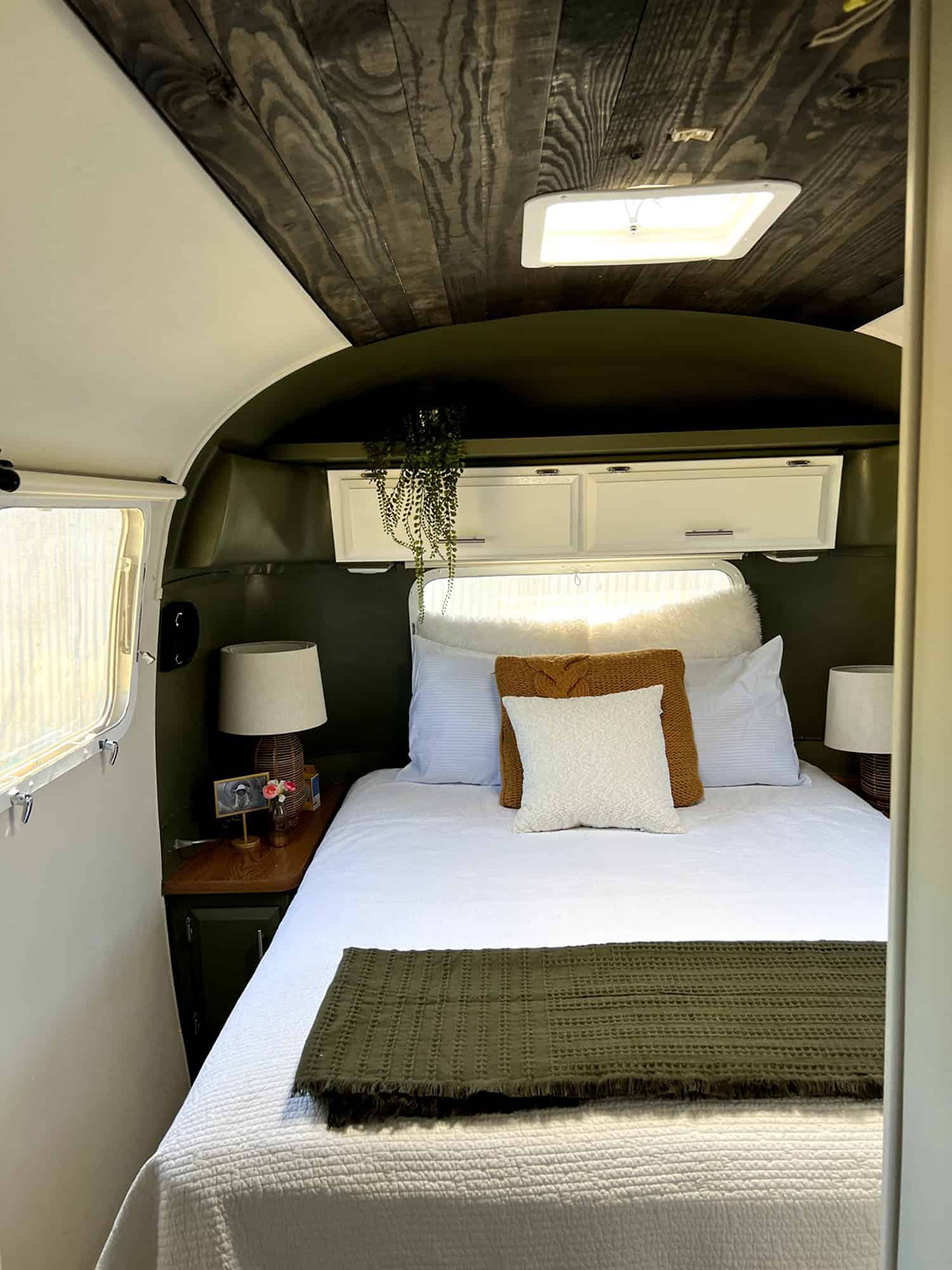 Love the idea of waking up in nature? This Airstream bedroom brings the outdoors in with a wood-plank ceiling that adds instant character. Olive-green accents on the walls and furniture blend beautifully with crisp white bedding. Pops of gold and soft textures in the pillows make the bed extra inviting. There’s a relaxed, calming energy in this space, thanks to the mix of earthy colors and natural light from the windows. A little plant above the bed adds a finishing touch, making this the perfect spot to unwind.