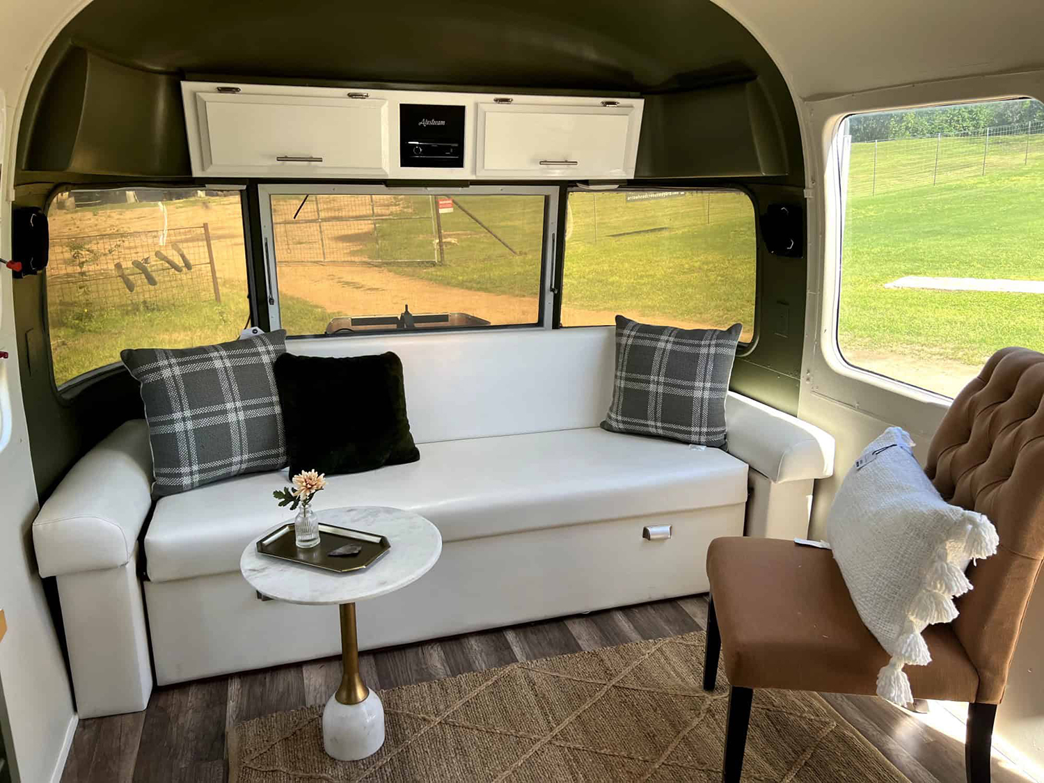 Looking for a living room that feels just like home? This Airstream lounge has it all. The crisp white sofa is lined with plush plaid and velvet pillows for extra comfort. Natural light streams in through big windows, giving you a front-row seat to the outdoors. A marble-topped table adds a hint of luxury, and a tufted accent chair brings extra style. The green accent wall frames the space and gives it a cozy, grounded feel. Everything about this setup says “welcome home!”