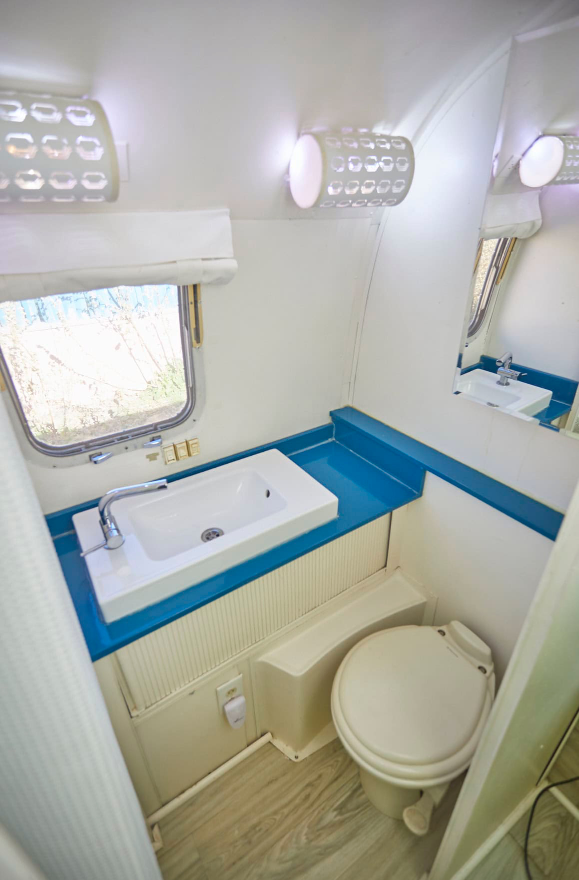 Get ready to smile every morning! This Airstream bathroom is bright, fresh, and packed with personality. The blue countertop adds a fun pop of color, making the space feel lively and inviting. Clean white walls, a modern sink, and practical lighting keep the look simple and tidy. There’s plenty of counter space for your daily essentials, and the window lets in natural light. The whole space is proof that even a tiny bathroom can make a big impression.