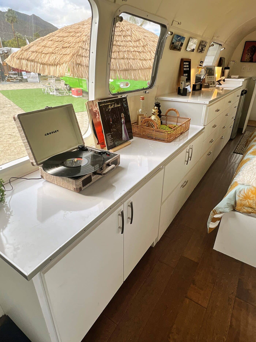 Turn up the tunes and let the good times roll! This Airstream’s long, white counter is perfect for displaying your favorite records, snacks, and decor. Storage cabinets below keep everything neat, while the glossy finish reflects sunlight and keeps the space bright. Vintage touches, like the record player and pineapple decor, mix with modern comforts for a look that’s timeless and fun. Step out the window and you’re right at a tiki hut—talk about the ultimate vacation setup! This interior proves you can have style, storage, and personality, all in one sleek package.