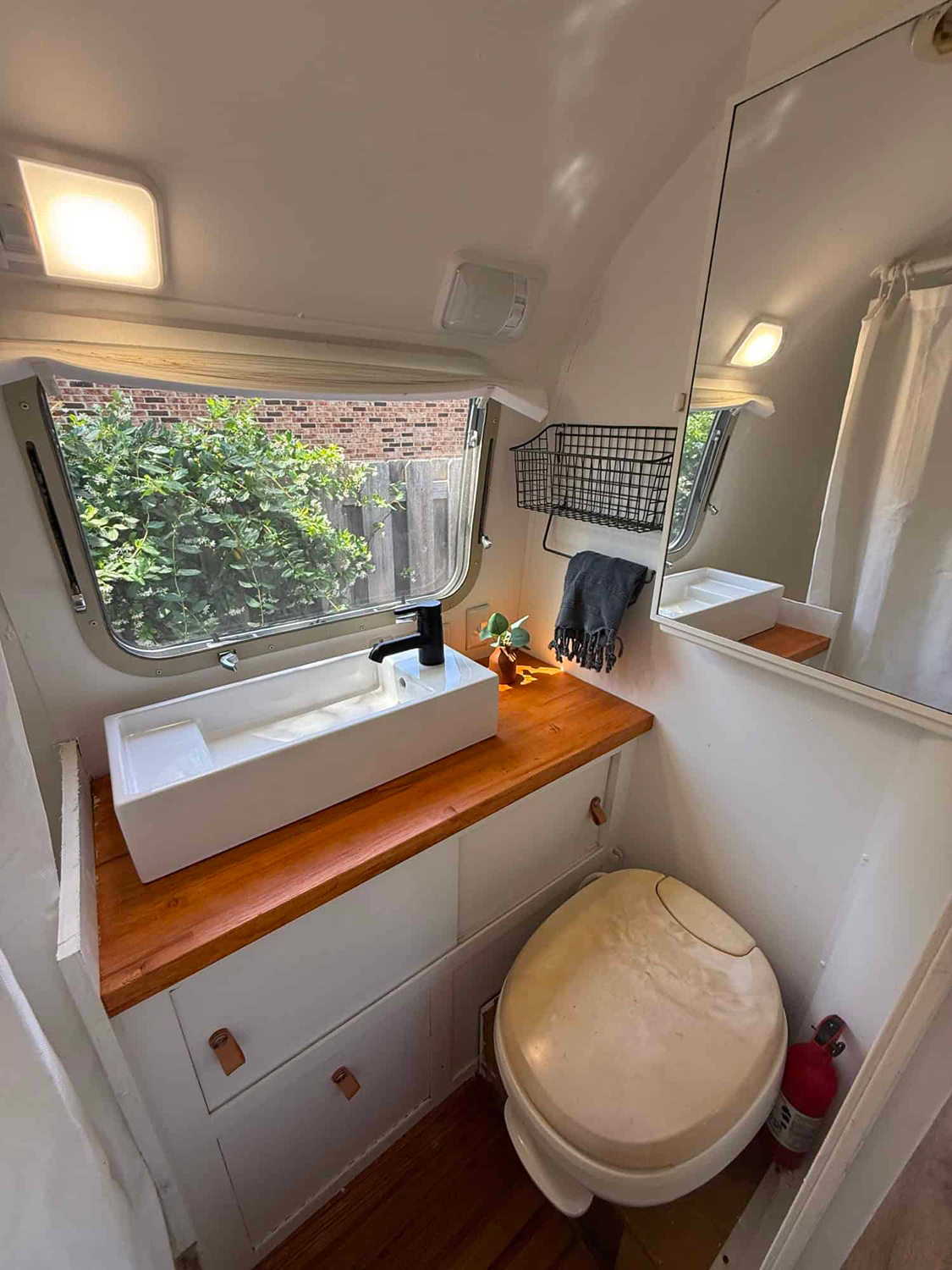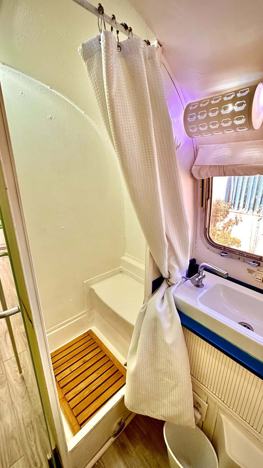 Who says you can’t have a spa day in an Airstream? This shower setup is all about clean, fresh style. The white tile and bright walls bounce light all around, making the space feel open and welcoming. The wooden shower mat brings a touch of nature underfoot, and the curtain gives you privacy without crowding the space. There’s a real sense of calm here, thanks to the simple layout and clever use of materials. Even the light fixtures feel special! This is a bathroom that makes every day feel like a treat.