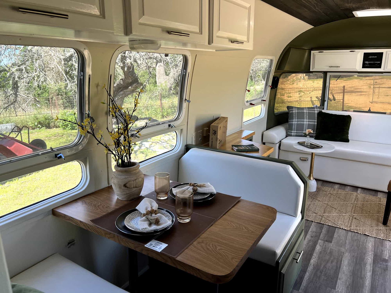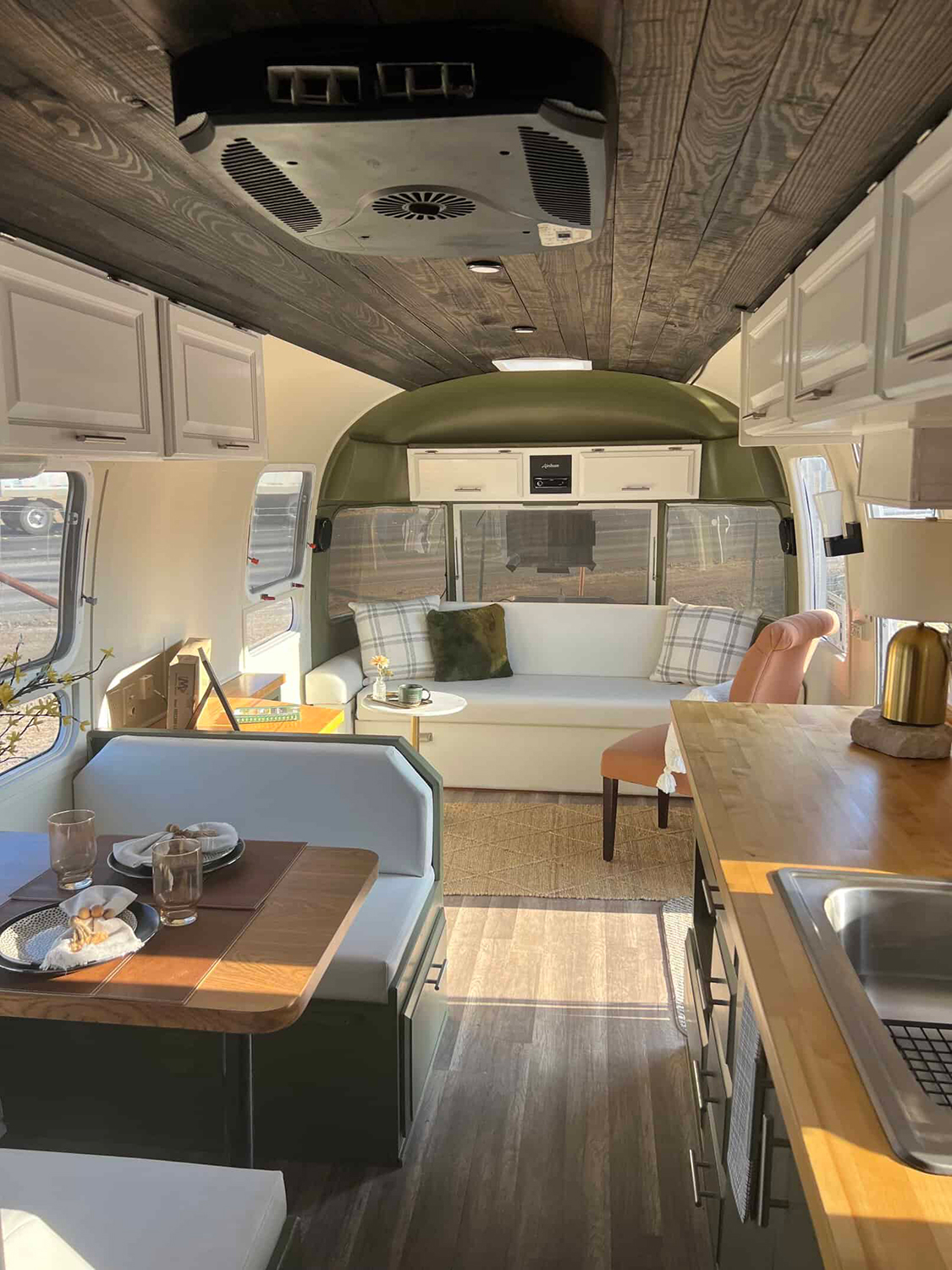 Love a space that feels fresh and stylish? This Airstream interior delivers. The wood countertop in the kitchen gleams in the sunlight, while the dark plank ceiling adds drama and warmth. The layout flows from kitchen to dinette to lounge, so it feels open and connected. Cozy white benches and green accent walls tie into the natural setting outside. You can host friends, play games, or just stretch out and enjoy the view. Every inch is used smartly, with cabinets overhead for all your essentials.