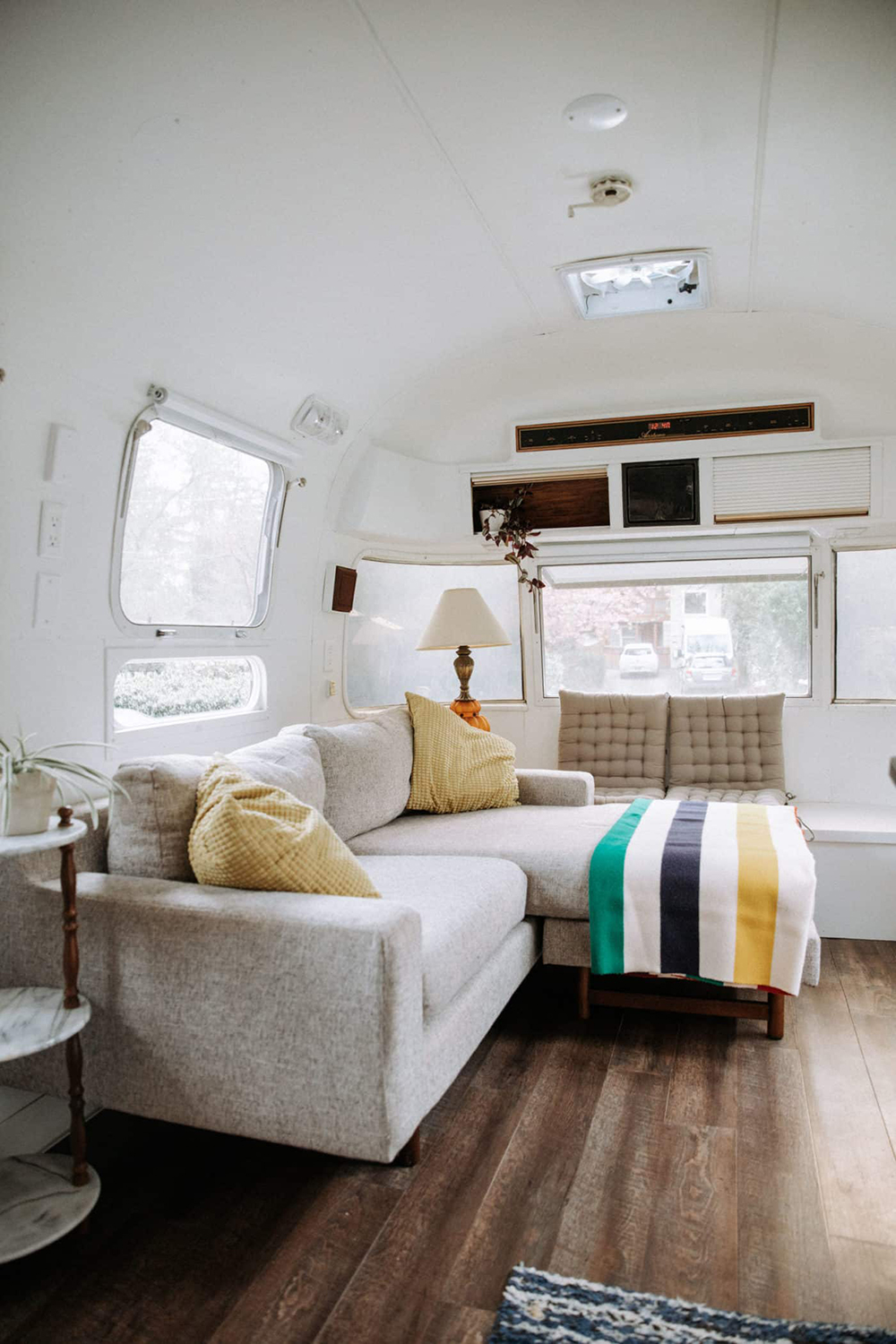 Need a break from the road? Sink into this dreamy sofa nook! Soft, textured pillows and a bold striped blanket make this spot feel like a cozy corner in your favorite boutique hotel. Natural light streams in through wide windows, making it the best seat in the house. The white walls keep things fresh, while the deep wood floors add warmth underfoot. A small side table and a classic lamp bring in homey charm. Every detail invites you to relax, stretch out, and enjoy the view—no matter where your travels take you.