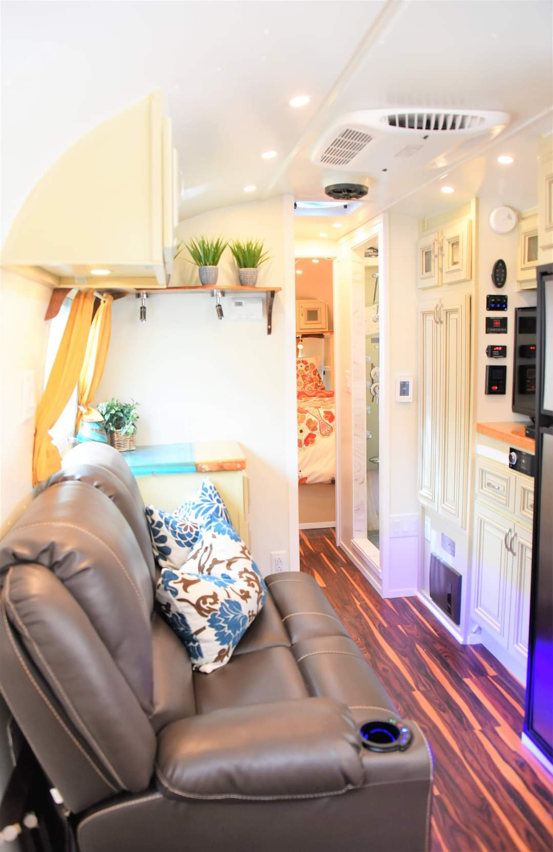 Take a seat and relax! This living area is all about comfort. A dark leather sofa offers the perfect spot to lounge, and bright pillows bring in playful pops of blue and brown. A shelf lined with potted plants adds a fresh, natural touch. Soft, recessed lighting overhead keeps the vibe warm and welcoming. From the soft yellow curtains to the cozy corners, this space feels like home on the road. The flow to the bedroom in the back keeps everything open and easy.