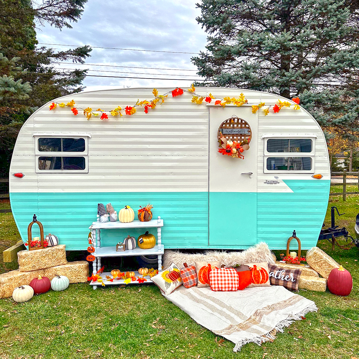 Soft aqua paired with white makes this camper feel like a seaside cottage, even far from the beach. Seasonal touches—pumpkins, hay bales, and plaid pillows in fall—bring warmth and charm. A leaf garland around the door finishes the cozy look. This setup proves that paint is just the beginning. Layer in décor, and your camper feels like home wherever you park it.