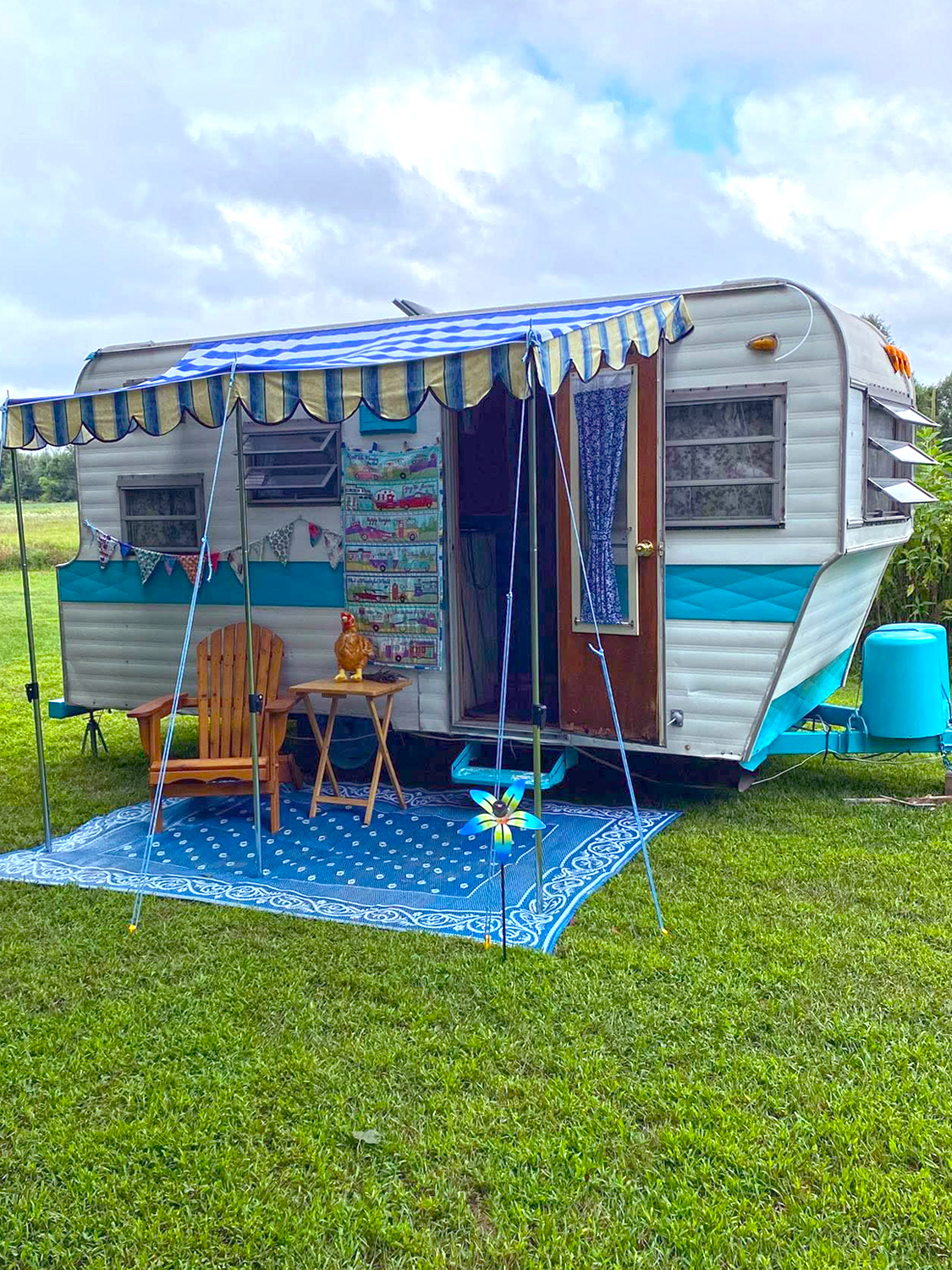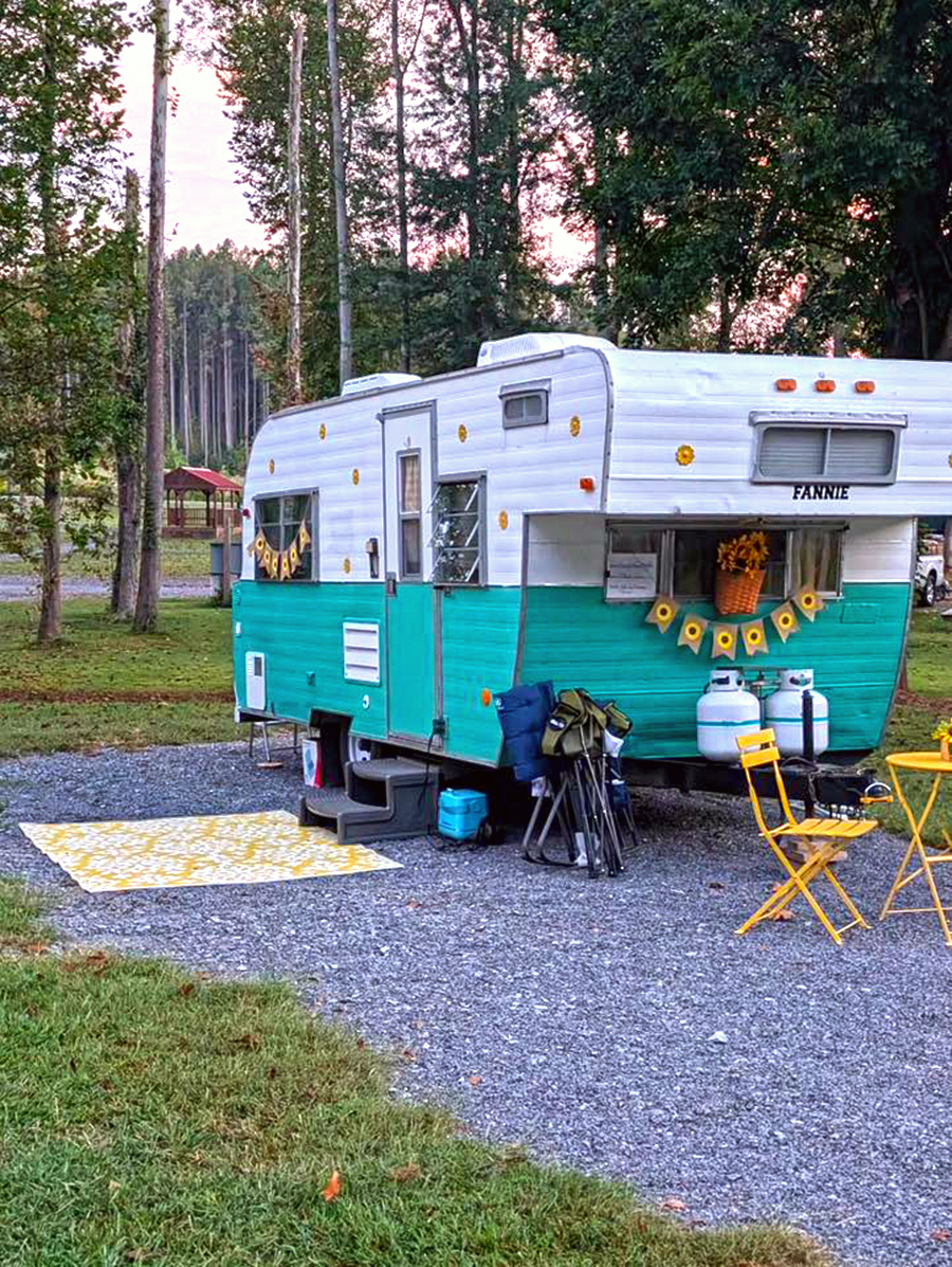 Bright and cheerful, this camper pairs turquoise-and-white paint with sunflower accents. A festive banner and flower-filled window box add warmth and charm. Outside, a yellow bistro set with a matching rug completes the sunny setup. This trailer shows how simple details—like flowers and coordinated colors—can make any camper feel like home.