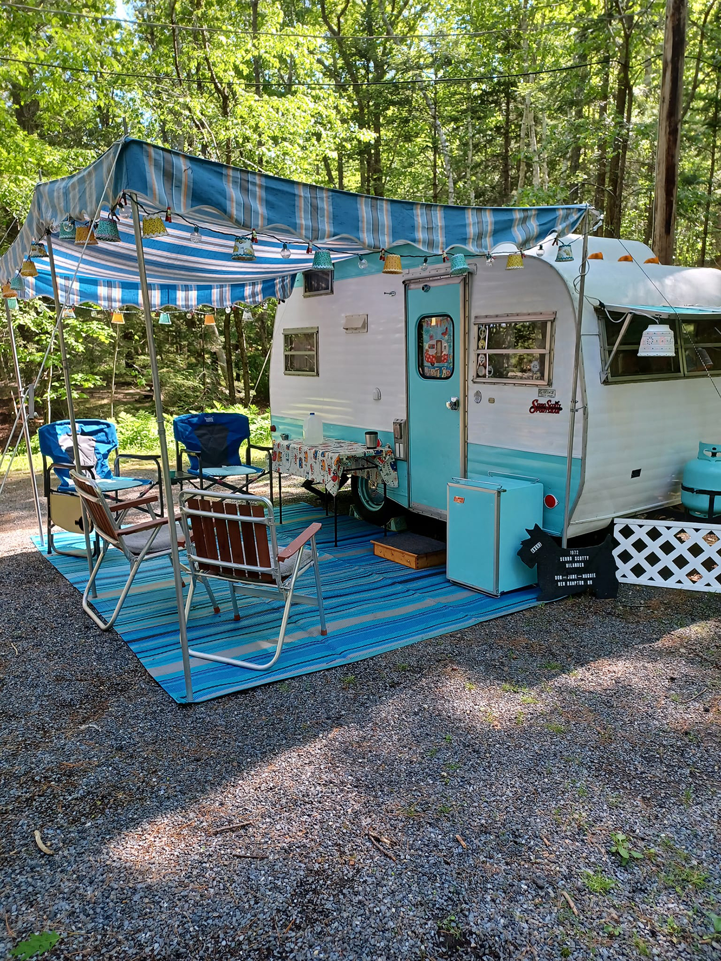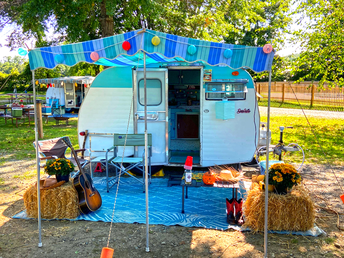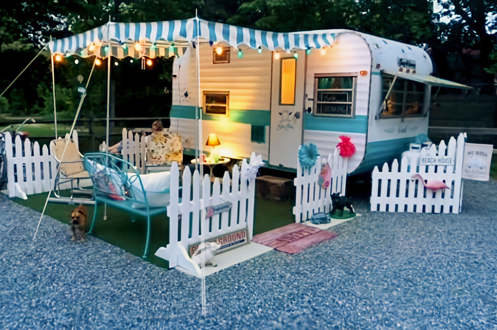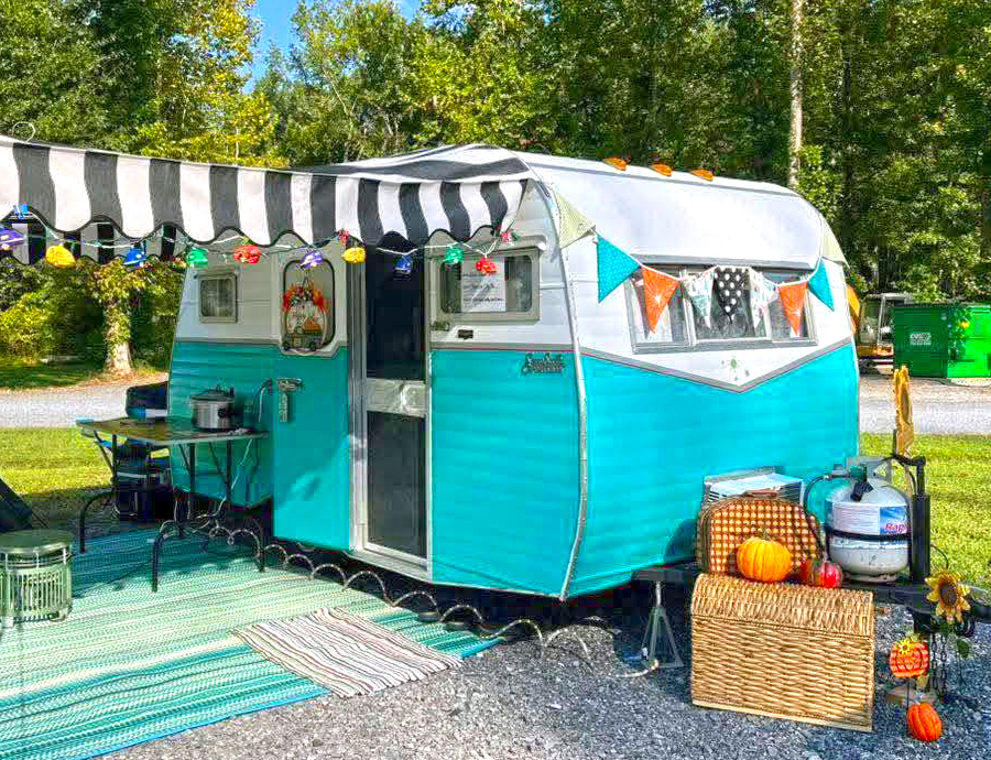Fun and lively, this teal-and-white camper shines under its bold striped awning. The black-and-white canopy pops against the bright teal body. Strings of colorful lights and cheerful bunting add personality. Pumpkins and a wicker hamper give it a seasonal twist. The whole look is playful, whimsical, and welcoming.