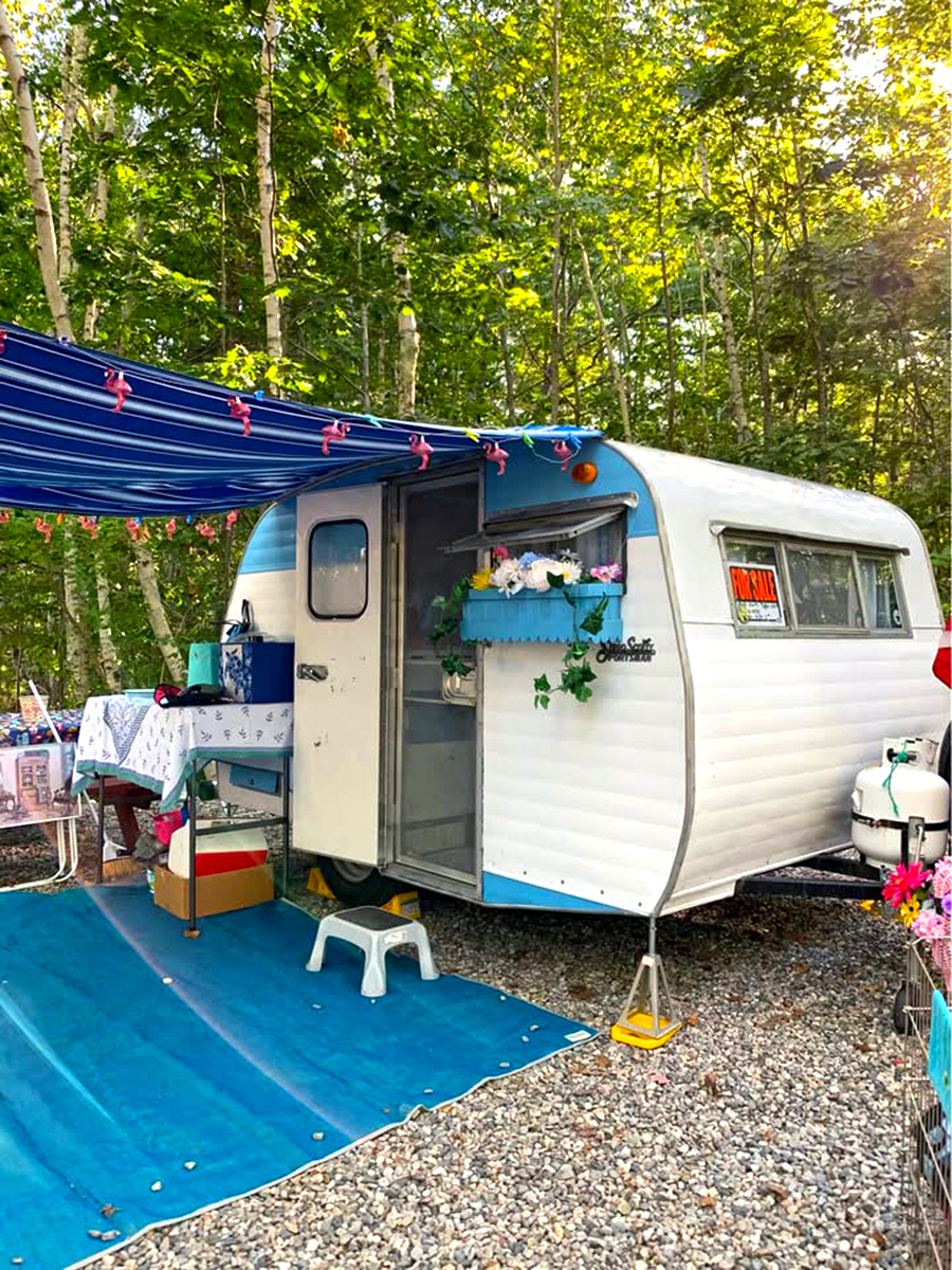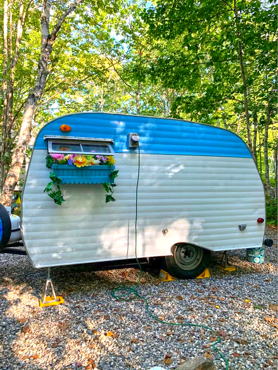 This camper looks like something from a fairytale. The two-tone paint—sky blue on top and crisp white on the bottom—gives it a cheerful, timeless look. The turquoise flower box under the window steals the show. Filled with colorful blooms, it turns the camper into a tiny cottage on wheels. The rounded roof and simple trim keep the focus on the playful details.